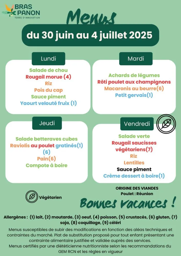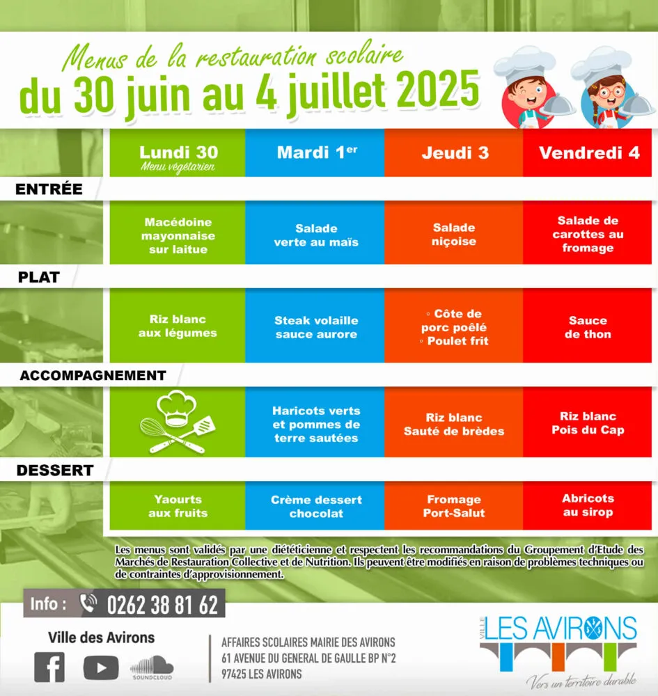 Actualités Kossa i manze à la cantine cette semaine du 30 juin au 4 juillet par Céline Hardelain 30 juin 2025 1 min de lecture Kossa i manze à la cantine cette semaine ? Découvrez les menus pour nos marmailles du 30 juin au 4 juillet. Bras-Panon Les Avirons Saint-Pierre Saint-Paul Saint-Benoit Saint-Louis Ne manquez pas toute l’actualité de La Réunion ! Abonnez-vous à la newsletter de Free Dom ! Valider Partager Facebook Twitter Pinterest Linkedin Whatsapp Reddit Email Vous pourriez être intéressé par 2 janvier 2026 1 janvier 2026 Jeudi 1ᵉʳ janvier 2026 – Météo, éphéméride et horoscope du jour 31 décembre 2025 Mercredi 31 décembre 2025 – Météo, éphéméride et horoscope du jour Céline Hardelain Laisser un commentaire Annuler la réponseYour email address will not be published. Enregistrer mon nom, mon e-mail et mon site dans le navigateur pour mon prochain commentaire. Current ye@r * Leave this field empty Article précédent Johnny Damour, un exemple de courage et de détermination : champion de France de boccia malgré son handicap Article suivant Psychose alimentaire à Madagascar : l’inquiétude grandit (Podcasts) Articles récents... Jeudi 1ᵉʳ janvier 2026 – Météo, éphéméride et horoscope du jour Mercredi 31 décembre 2025 – Météo, éphéméride et horoscope du jour Hommage à Johnny Hallyday sur Free Dom 2 ce 5 décembre Mardi 30 décembre 2025 – Météo, éphéméride et horoscope du jour Saint-Joseph : découverte de 2337 plants de cannabis, arrestation de 2 individus Point sur le réseau routier départemental, 29 décembre à 16H30 Suicide sur le pont de la Rivière d’Abord : importante mobilisation des secours et des forces de l’ordre Radier submergé à Ilet Furcy : la route de Cilaos fermée à la circulation cette nuit Fortes pluies : appel à la plus grande prudence à Saint-Paul