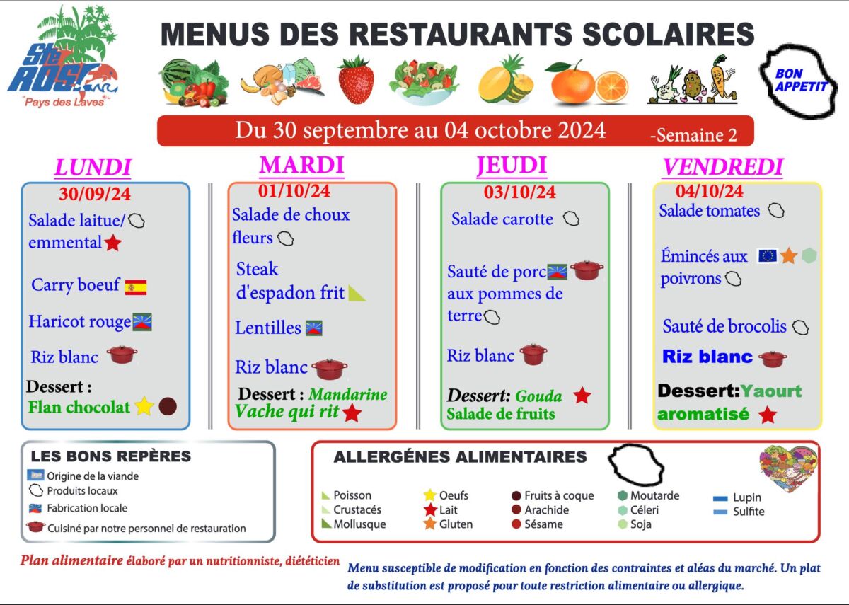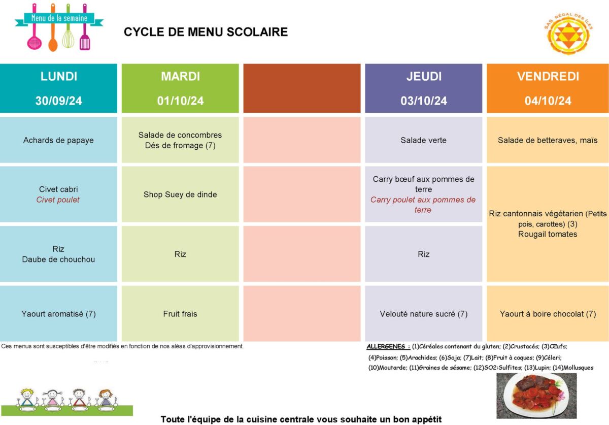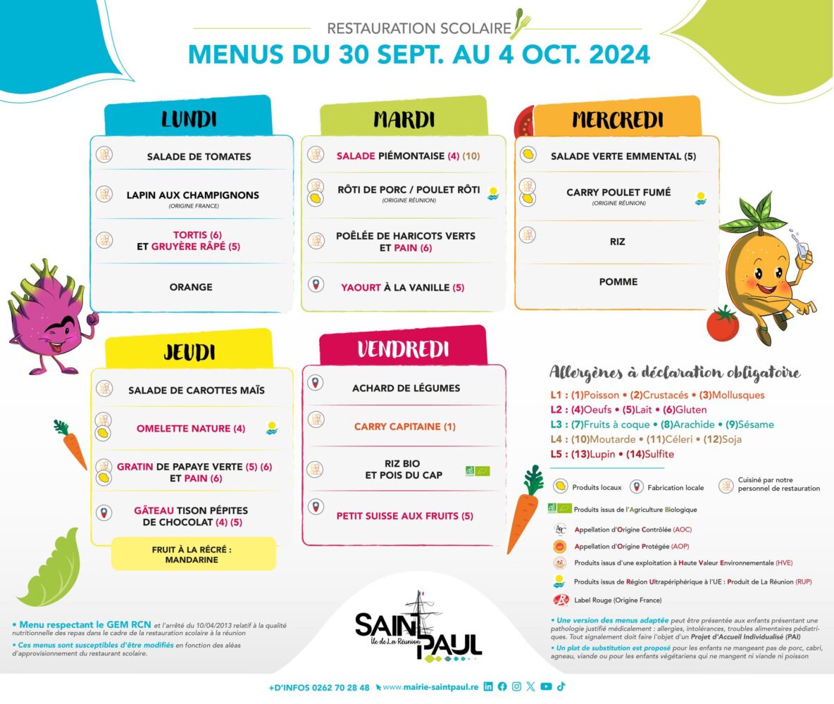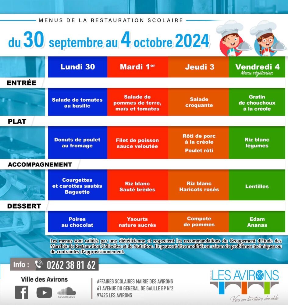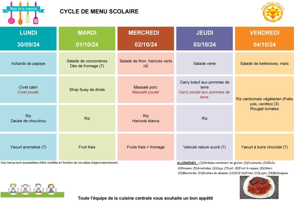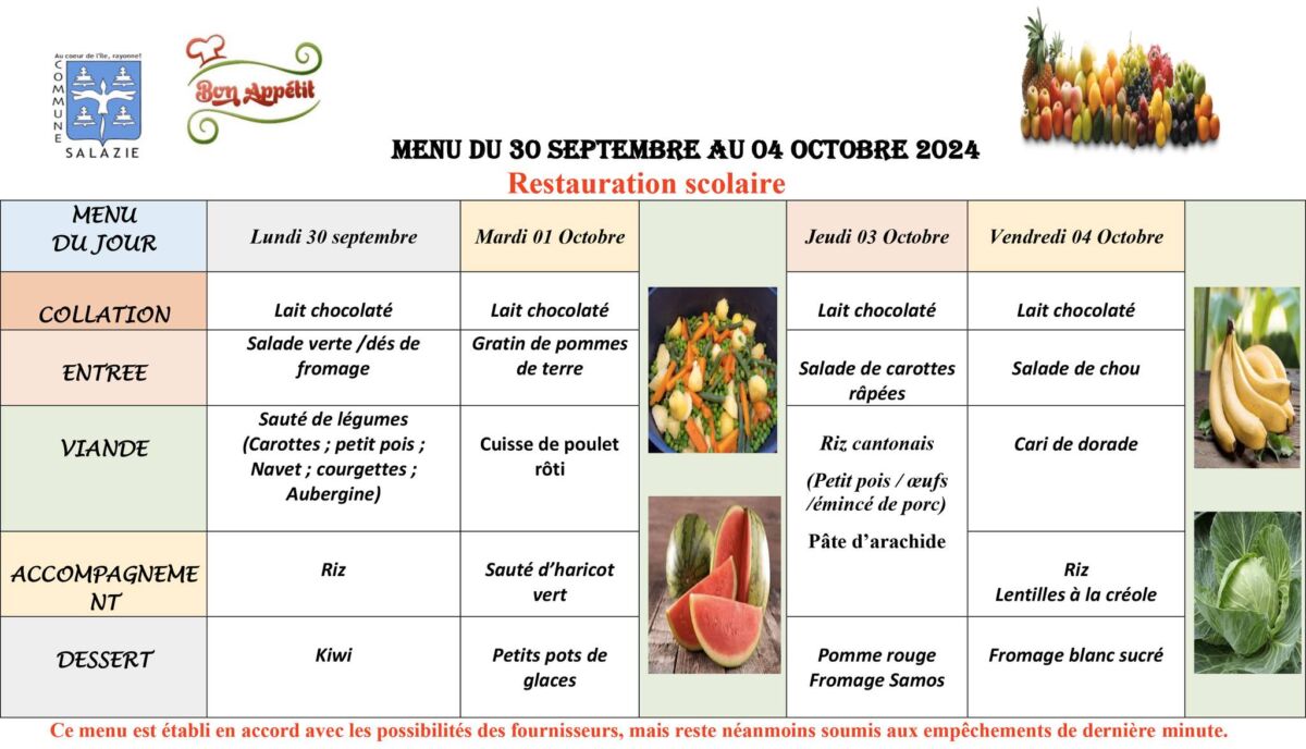 Les menus de la restauration scolaire du lundi 30 septembre au 4 octobre.