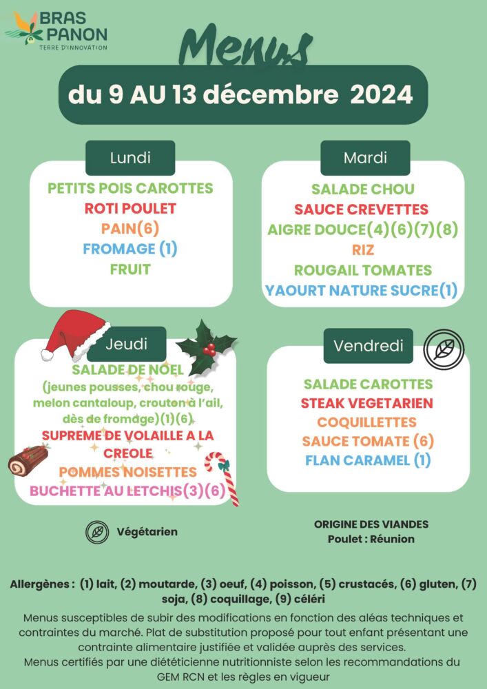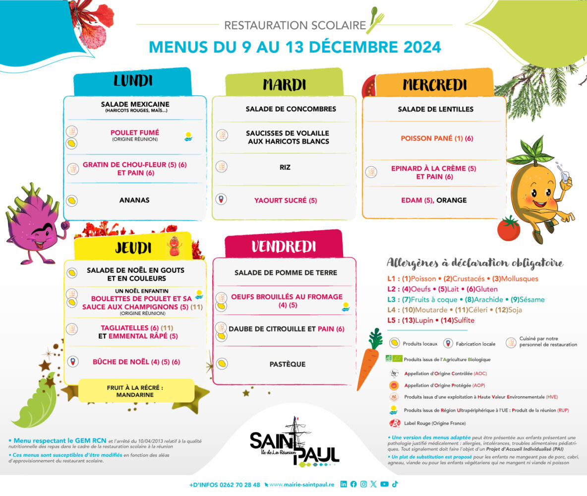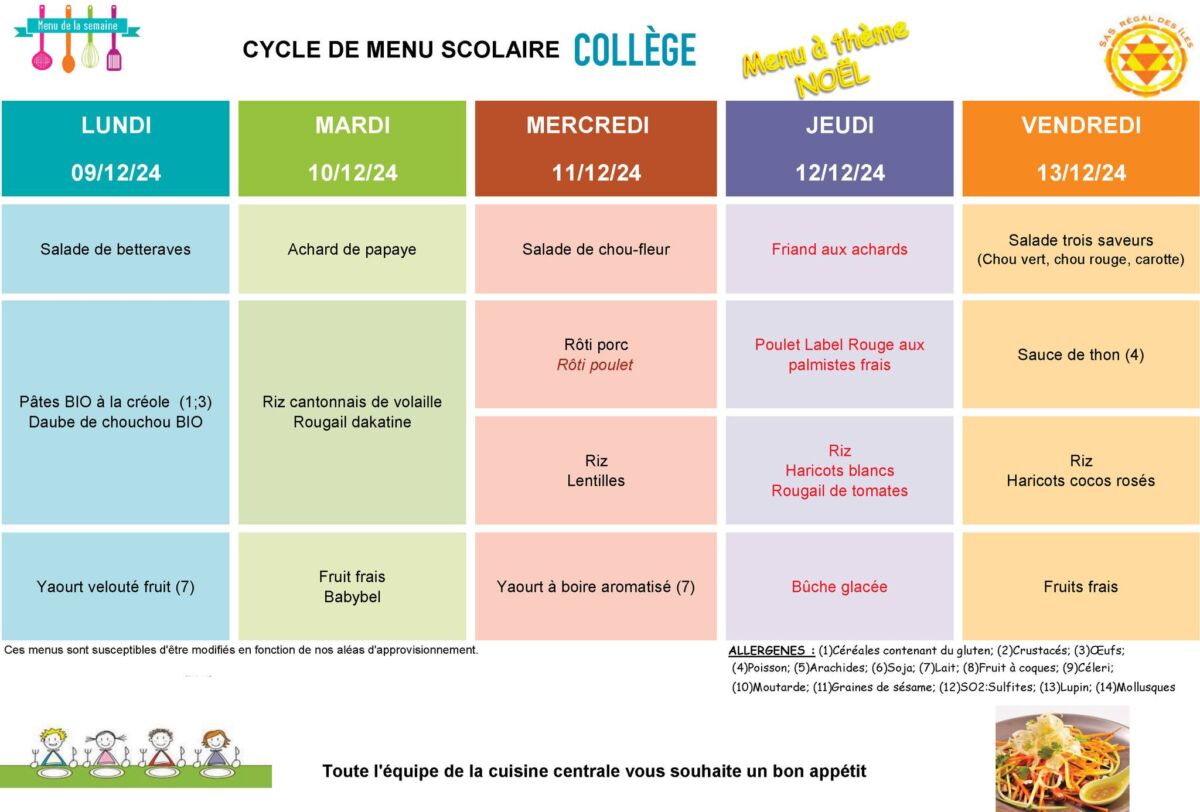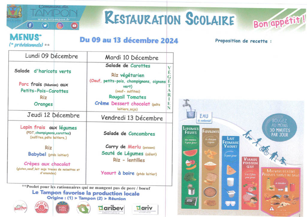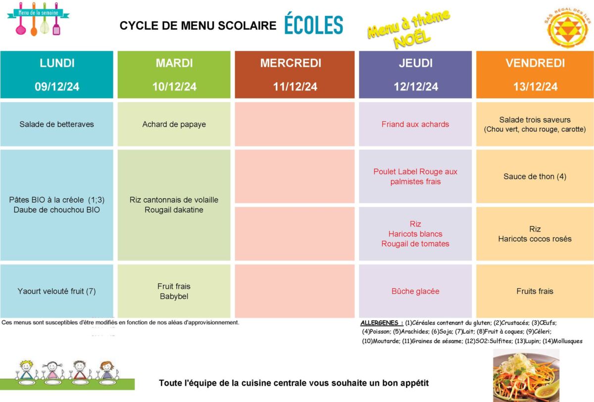 Les menus de la restauration scolaire du lundi 9 au vendredi 13 décembre.