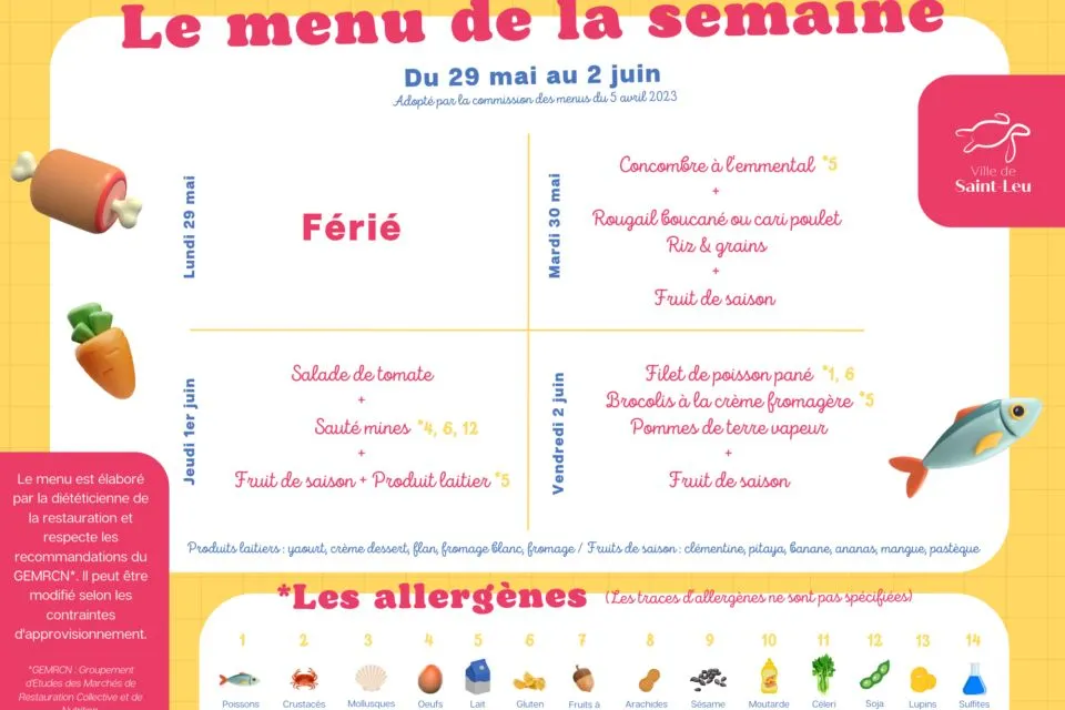Actualités Kossa i manze à la cantine cette semaine ? par Guillaume Martin 30 mai 2023 1 min de lecture Les menus des cantines des communes qui ont bien voulu nous les communiqués ou qui les ont posté sur les réseaux sociaux pour la semaine du 30 mai au 02 juin 2023. BRAS PANON LES AVIRONS SAINT BENOIT SAINT PIERRE LA POSSESSION SAINTE MARIE SAINTE ROSE LE PORT SAINT LEU TROIS BASSINS CILAOS SAINT PAUL SAINT LOUIS L’ETANG SALÉ LA PETITE ILE LE TAMPON SAINT ANDRÉ SALAZIE Ne manquez pas toute l’actualité de La Réunion ! Abonnez-vous à la newsletter de Free Dom ! Valider Partager Facebook Twitter Pinterest Linkedin Whatsapp Reddit Email Vous pourriez être intéressé par 3 janvier 2026 Samedi 3 janvier 2026 – Météo, éphéméride et horoscope du jour 2 janvier 2026 1 janvier 2026 Jeudi 1ᵉʳ janvier 2026 – Météo, éphéméride et horoscope du jour Guillaume Martin Laisser un commentaire Annuler la réponseYour email address will not be published. Enregistrer mon nom, mon e-mail et mon site dans le navigateur pour mon prochain commentaire. Current ye@r * Leave this field empty Article précédent Aimée Arzeux : une nouvelle centenaire au Port Article suivant OTI Ouest : 9ème Festival de l’Océan du 2 au 17 juin 23 sur la Côte Ouest (Vidéo-Photos) Articles récents... Samedi 3 janvier 2026 – Météo, éphéméride et horoscope du jour Jeudi 1ᵉʳ janvier 2026 – Météo, éphéméride et horoscope du jour Mercredi 31 décembre 2025 – Météo, éphéméride et horoscope du jour Hommage à Johnny Hallyday sur Free Dom 2 ce 5 décembre Mardi 30 décembre 2025 – Météo, éphéméride et horoscope du jour Saint-Joseph : découverte de 2337 plants de cannabis, arrestation de 2 individus Point sur le réseau routier départemental, 29 décembre à 16H30 Suicide sur le pont de la Rivière d’Abord : importante mobilisation des secours et des forces de l’ordre Radier submergé à Ilet Furcy : la route de Cilaos fermée à la circulation cette nuit