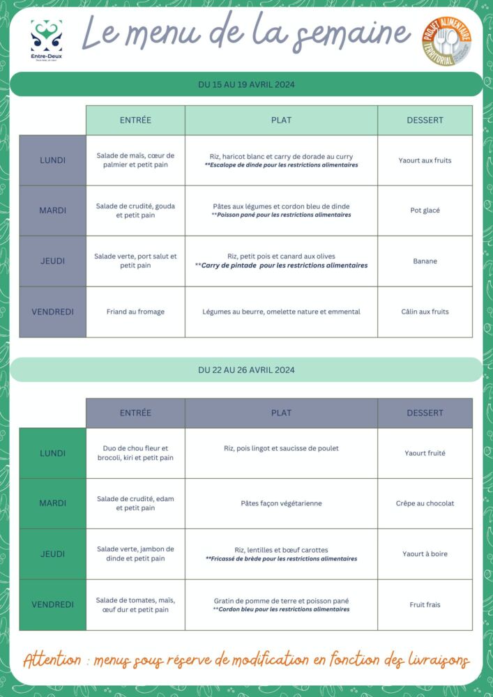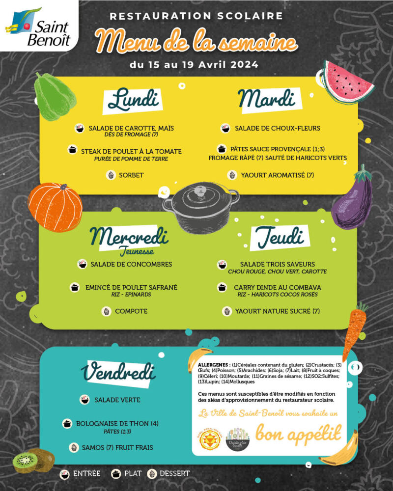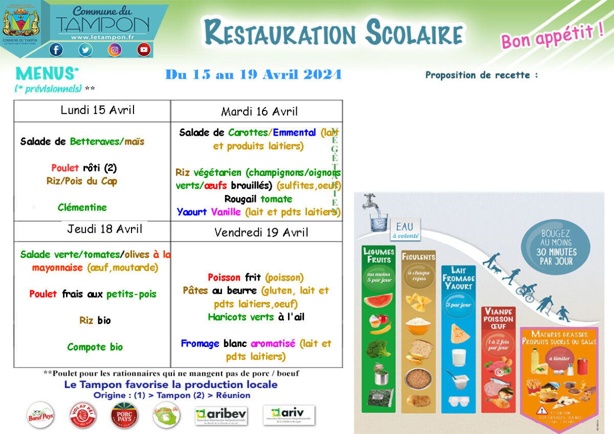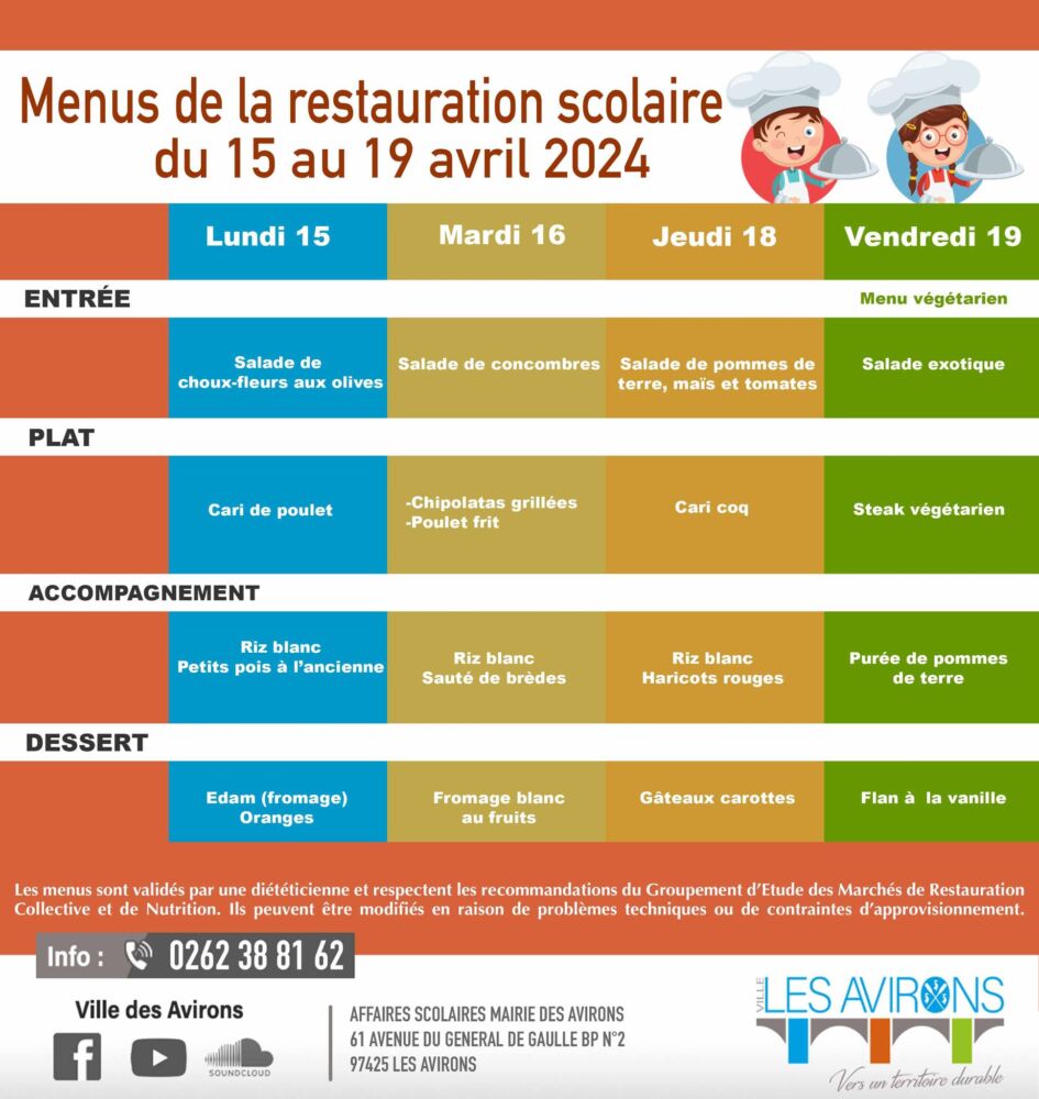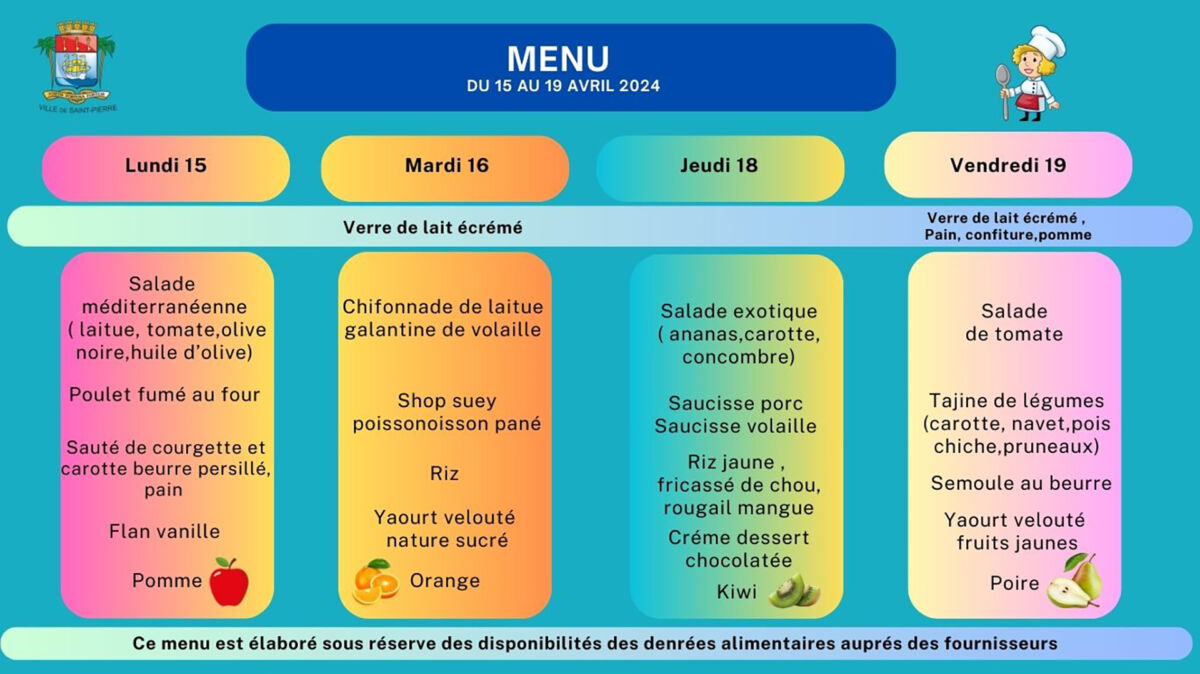 Actualités Kossa i manze à la cantine cette semaine du 15 au 19 avril par Céline Hardelain 15 avril 2024 1 min de lecture Les menus de la restauration scolaire du lundi 15 au 19 avril. St-Pierre Bras-Panon Etang-Salé Cilaos Les Avirons St-Louis Ste-Rose St-Benoit St-Paul Le Port Le Tampon Entre-Deux Ne manquez pas toute l’actualité de La Réunion ! Abonnez-vous à la newsletter de Free Dom ! Valider Partager Facebook Twitter Pinterest Linkedin Whatsapp Reddit Email Vous pourriez être intéressé par 2 janvier 2026 1 janvier 2026 Jeudi 1ᵉʳ janvier 2026 – Météo, éphéméride et horoscope du jour 31 décembre 2025 Mercredi 31 décembre 2025 – Météo, éphéméride et horoscope du jour Céline Hardelain Laisser un commentaire Annuler la réponseYour email address will not be published. Enregistrer mon nom, mon e-mail et mon site dans le navigateur pour mon prochain commentaire. Current ye@r * Leave this field empty Article précédent Madagascar : décès tragique d’un ressortissant français dans un taxi-brousse Article suivant Sauvetage en eaux vives : Les pompiers se forment à Saint-Joseph Articles récents... Jeudi 1ᵉʳ janvier 2026 – Météo, éphéméride et horoscope du jour Mercredi 31 décembre 2025 – Météo, éphéméride et horoscope du jour Hommage à Johnny Hallyday sur Free Dom 2 ce 5 décembre Mardi 30 décembre 2025 – Météo, éphéméride et horoscope du jour Saint-Joseph : découverte de 2337 plants de cannabis, arrestation de 2 individus Point sur le réseau routier départemental, 29 décembre à 16H30 Suicide sur le pont de la Rivière d’Abord : importante mobilisation des secours et des forces de l’ordre Radier submergé à Ilet Furcy : la route de Cilaos fermée à la circulation cette nuit Fortes pluies : appel à la plus grande prudence à Saint-Paul