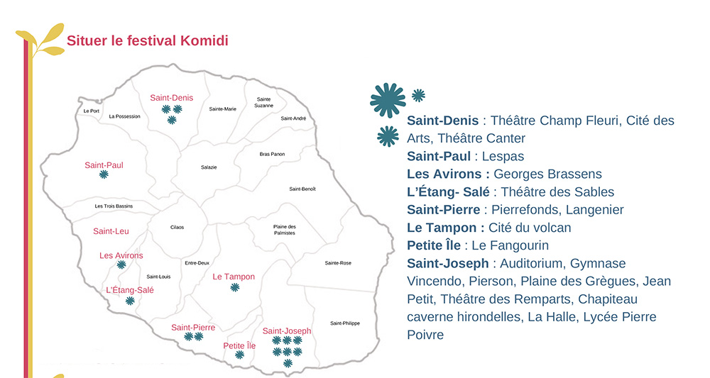 Durant 12 jours, du Mardi 23 Avril au Samedi 4 Mai, la 16e édition du festival de théâtre Komidi de l’île de La Réunion va se dérouler du Sud au Nord et dans certains villages reculés des hauts de l’île. De Saint-Joseph, au Sud de l’île, berceau de ce festival jusqu’à Saint-Denis, au Nord, en passant par Petite Île, Saint-Pierre, Tampon, Étang-Salé, les Avirons et Saint-Paul, ce sont 8 communes qui accueilleront 47 spectacles sur 19 scènes, joués par des compagnies professionnelles de La Réunion, de l’hexagone, de Belgique et de Suisse.