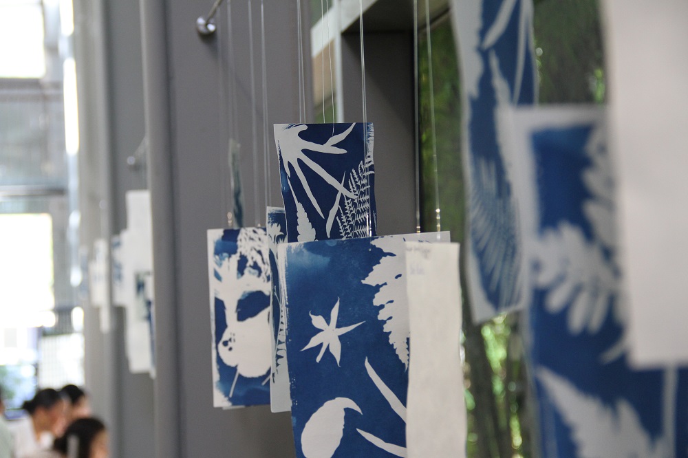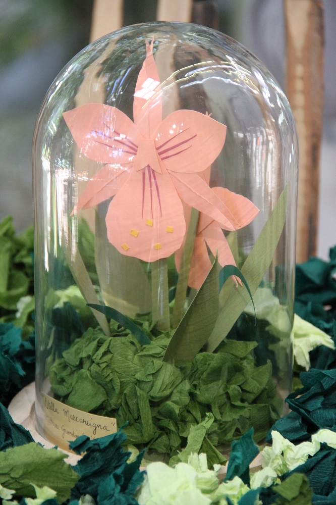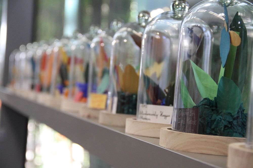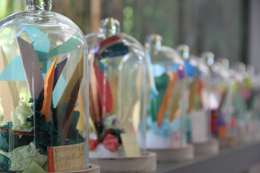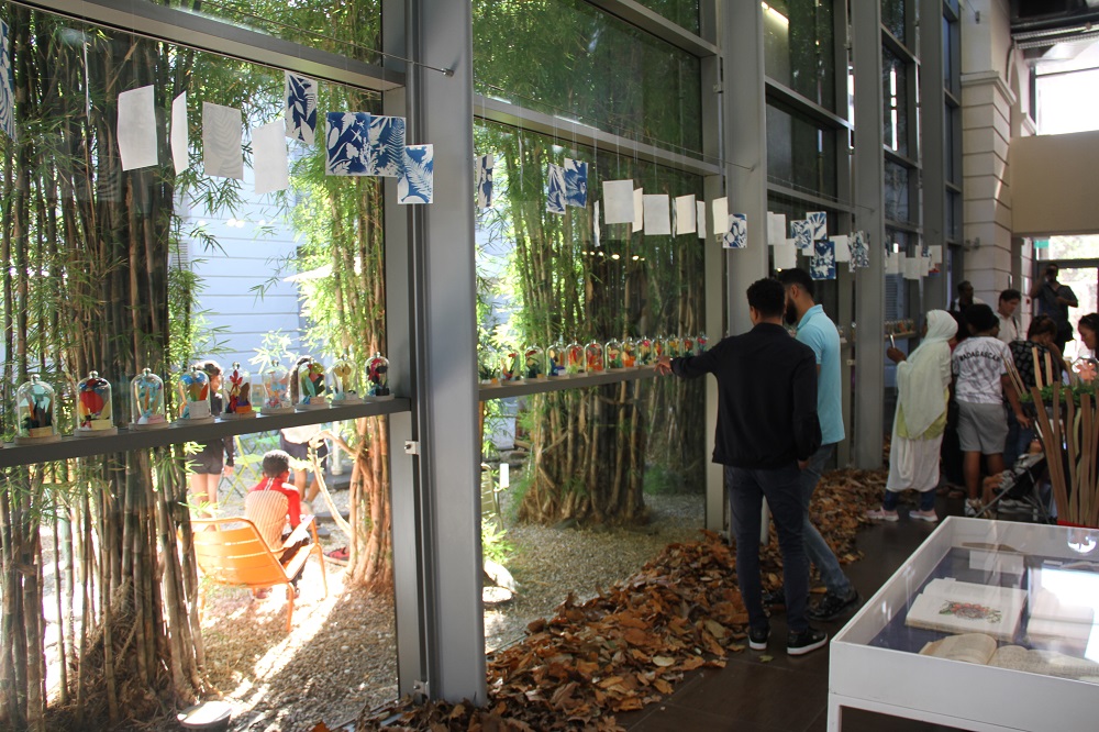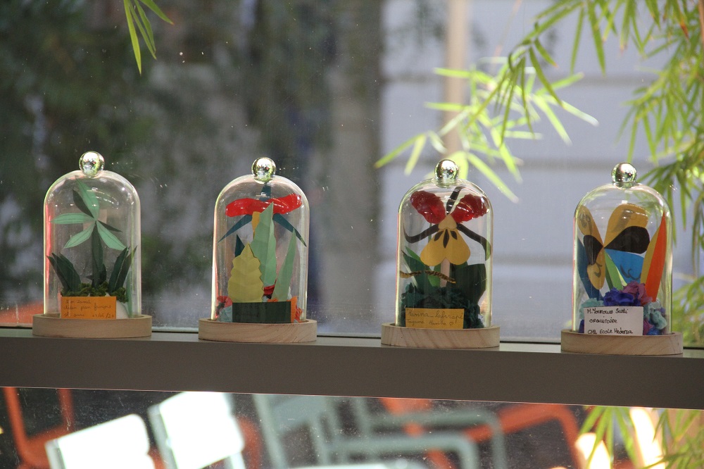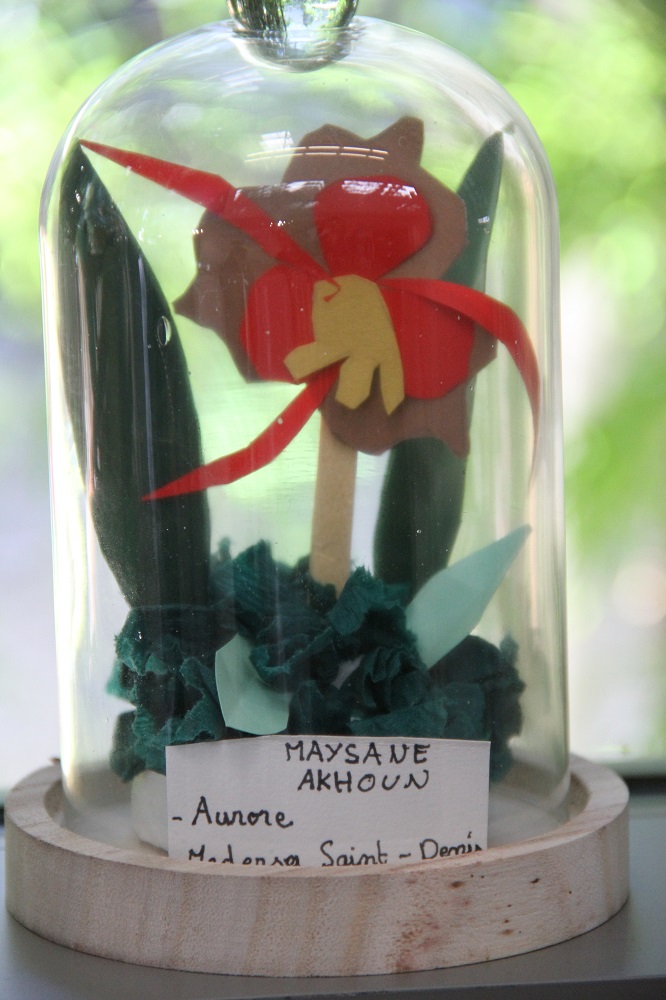 « Tout a commencé avec une balade dans la forêt Sainte-Marguerite où nous avons découvert les plantes endémiques. Ensuite, nous avons réalisé des cartes à partir des feuilles suivant la méthode du cyanotype ». rapportent Marlène, Lucie et Noa, fiers de leurs œuvres en « bleu outre-mer » exposées au milieu de l’écrin de verdure de la BdR. Les agents de la brigade des Espaces Naturels de la Direction de Tourisme et Espaces Naturels du Département ont largement contribué au bon déroulement de la balade et tout au long des ateliers. Pour le troisième atelier, les élèves ont créé des orchidées à partir du papier découpé. Placée sous cloche, chaque création porte un nom inventé par le jeune lui-même. « Chaque orchidée est unique et l’imagination florissante des enfants nous emporte dans une cosmopoétique créole, note Céline Aho Nienne, qui mise sur la réinvention de la mythologie réunionnaise ». Visible depuis son vernissage de ce 25 juin, jusqu’au 2 juillet prochain, l’exposition est une véritable « Ode à la flore. Une promenade dans les bois à la rencontre des ancêtres végétaux, rééls ou rêvés » pour reprendre les termes de l’auteure Céline Aho Nienne qui s’attache à « ré-enchanter la forêt de La Réunion« .