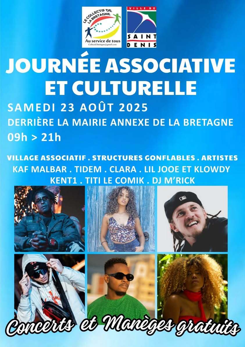 Le Collectif de la Bretagne, en partenariat avec la Ville de Saint-Denis de La Réunion, organisent une journée associative et culturelle le samedi 23 août 2025 de 09h00 à 21h00 derrière la mairie annexe de La Bretagne