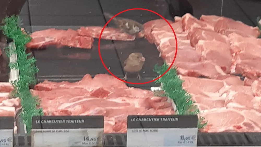 Des oiseaux sur l’étal de viande fraîche