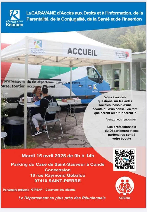 Le Département de La Réunion poursuit son engagement de proximité avec les citoyens à travers la Caravane d’Accès aux Droits et à l’Information, un dispositif itinérant qui s’adresse aux familles, futurs parents et personnes en quête d’accompagnement social ou administratif. La prochaine étape se tiendra le mardi 15 avril 2025, de 9h à 14h, sur le parking de la Case de Saint-Sauveur à Condé Concession, situé 16 rue Raymond Gobalou à Saint-Pierre.