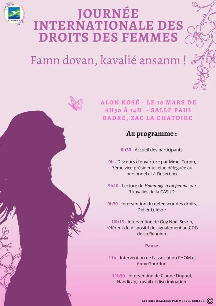 L’opération « Famn dovan, Kavalié ansanm ! » sera organisée par la Direction des Ressources Humaines de la CASUD, dans le cadre de la Journée Internationale des Droits des Femmes. Elle se déroulera sur 3 jours, sera interne à la CASUD, est ouverte à tous les agents et élus communautaires, femmes et hommes de la CASUD. Agents et élus ont donc été conviés aux diverses.sensibilisations et événements organisés du 8 au 10 mars.