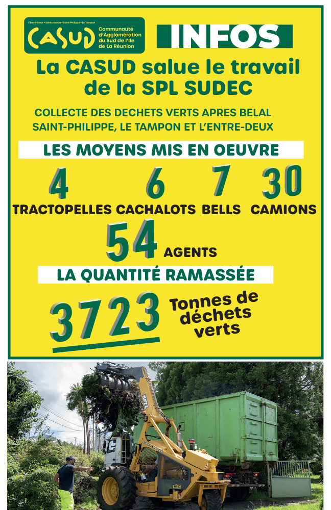 La SPL SUDEC a mis en place, suite au passage du Cyclone BELAL au mois de janvier dernier, une opération spéciale de collecte des déchets verts avec des moyens exceptionnels tant matériels que humains.