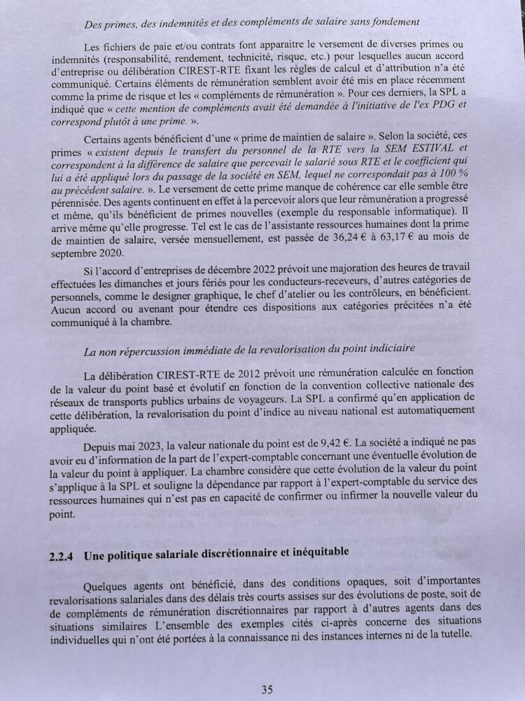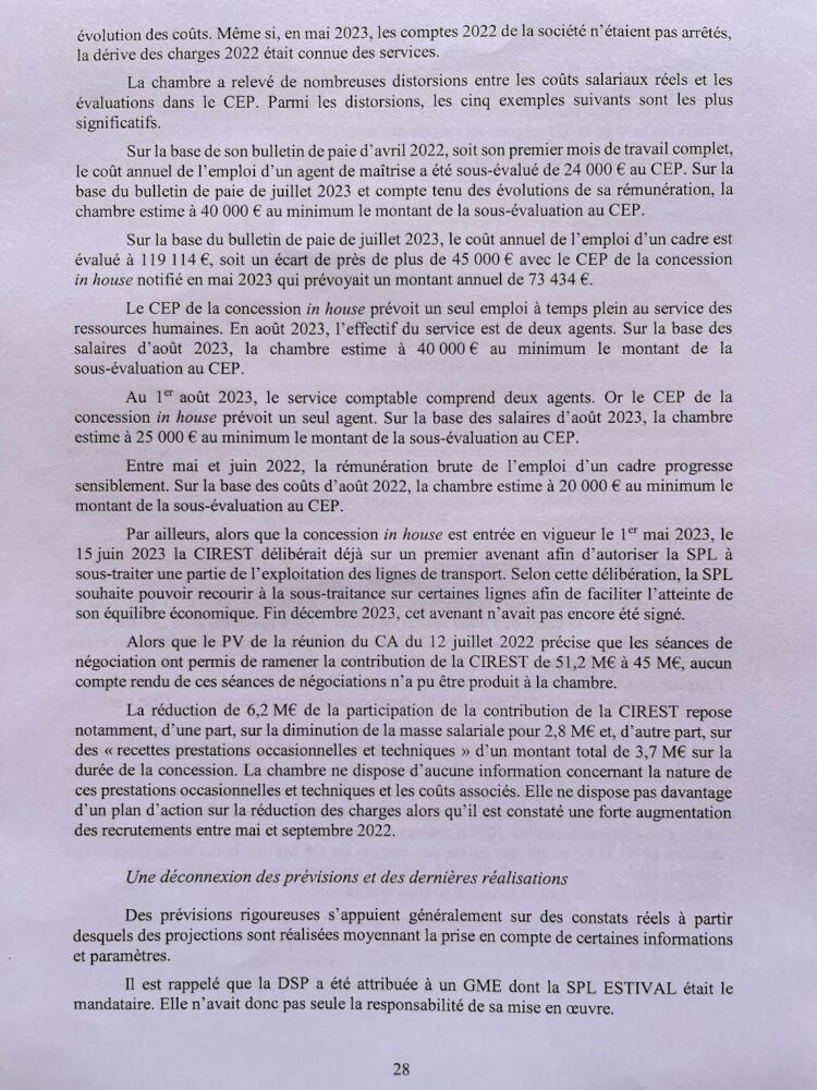 Le rapport pointe « une gouvernance défaillante », « des dispositifs de contrôle interne insuffisants » notamment à propos des marchés publics ; « un déficit d’exploitation depuis 2021 », « une progression très rapide des charges devenues largement supérieures aux produits », « des prévisions budgétaires insincères », « une gestion dispendieuse des ressources humaines, dépourvue de lisibilité », « une hausse marquée des effectifs sans lien avec l’évolution de l’activité », « la non présentation de décisions à conséquences financières au conseil d’administration », « des entorses au cadre de rémunération », « une politique salariale discrétionnaire et inéquitable », « des mauvais choix de gestion à des errements contestables », « des prestations douteuses réglées directement par l’ex PDG », « des choix coûteux : l’exemple des baux », « des arrangements avec les dispositions contractuelles de la délégation de service public… Bref, vous l’aurez compris, rien de vraiment rassurant, en dépit des efforts déployés ces derniers temps par le président par intérim et le conseil d’administration. Les clignotants de la SPL Estival sont toujours dans le rouge.