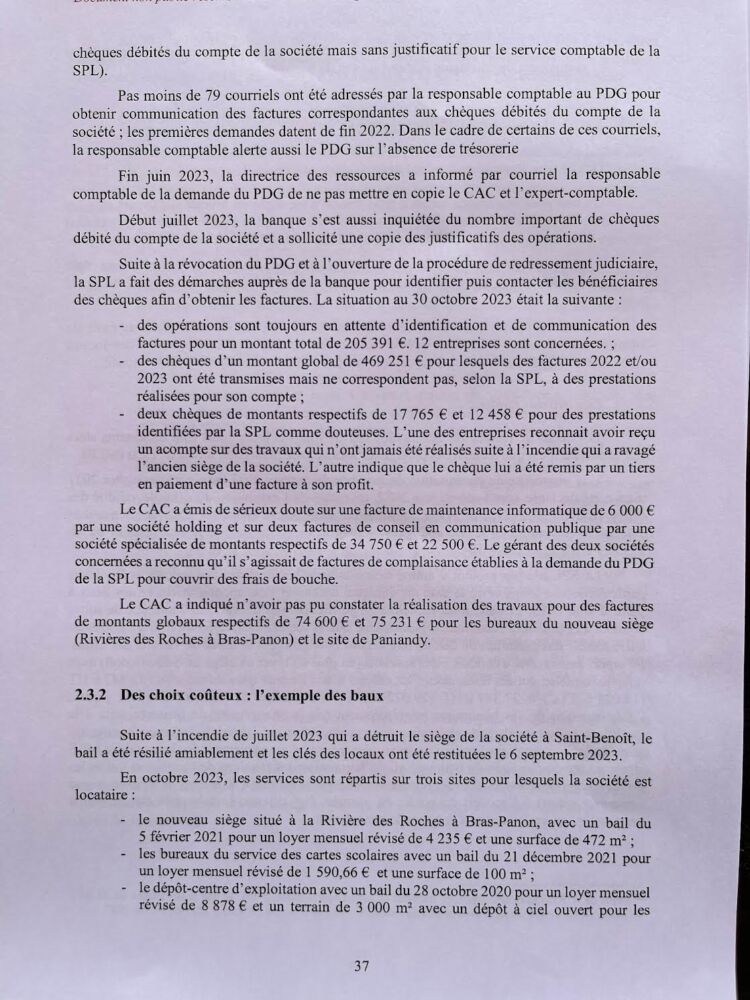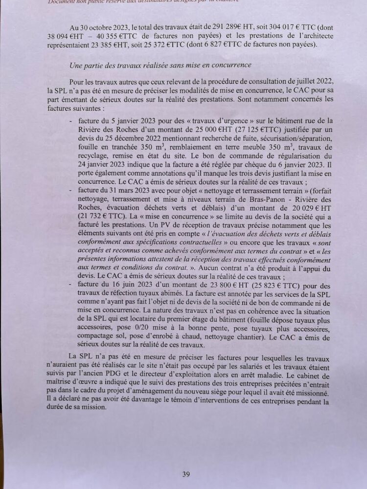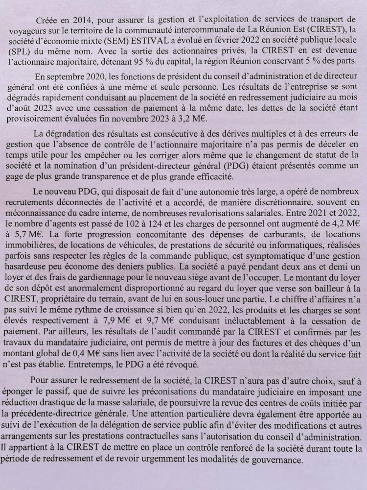 En attendant, la Chambre régionale des comptes a poursuivi son travail concernant la gestion de la SPL Estival et a ainsi rendu son rapport définitif. Lequel rapport sera, comme précisé ci-dessus, après les réponses faites par les principaux concernés, rendu public lors d’une prochaine réunion du conseil d’administration de la SPL et du conseil communautaire de la Cirest. A noter que le parquet de Saint-Denis, s’il est saisi par la CRC,  pourrait (le conditionnel est toujours de mise), sur la base dudit rapport, décider d’ouvrir (ou non) une information judiciaire. Pour l’instant, nous ne sommes pas encore à ce stade.