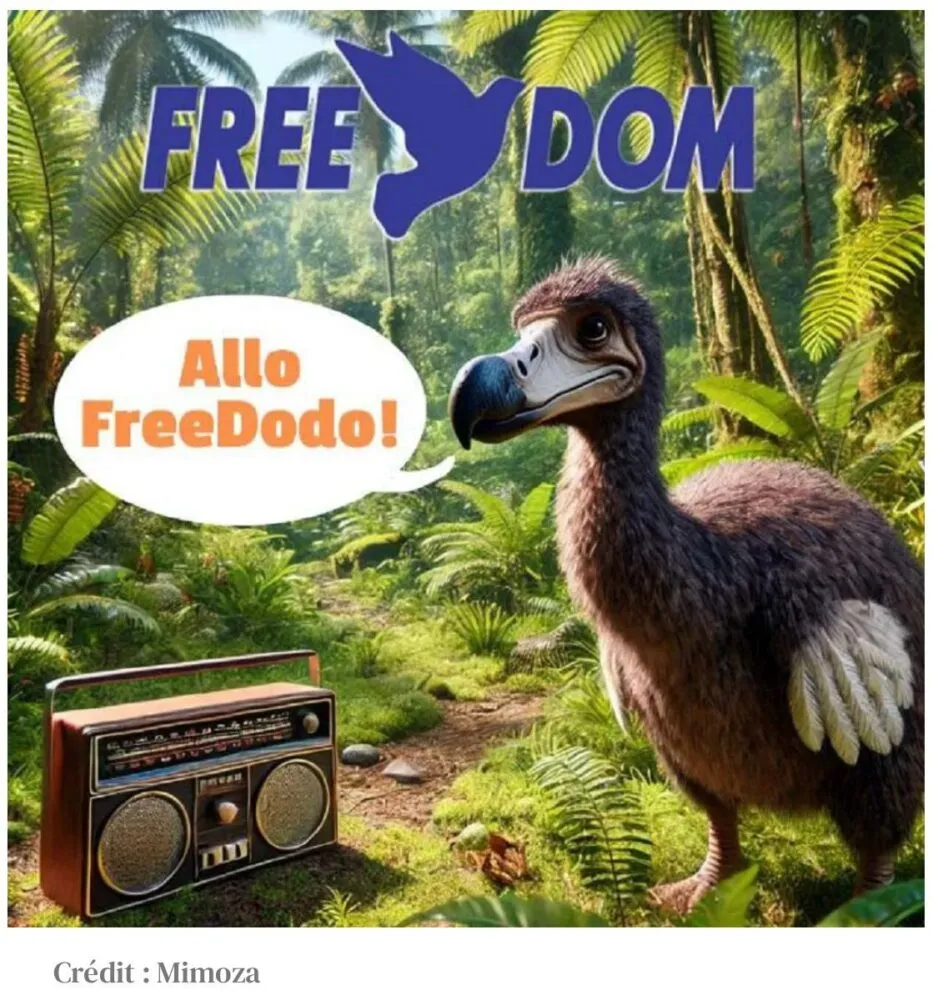 Regarder ce joli petit Dodo sur l’affiche : comme il a l’air sympa, il rigole, il téléphone à Free Dom, il a l’air heureux, il est dans le ciel au paradis des oiseaux, il a amené sa radio Free Dom !!!… est-ce que vous savez que le Dodo c’était un oiseau domestique comme un petit chat ou un petit chien : il aimait les hommes et il avait confiance en la nature humaine, on pouvait l’attraper facilement et on pouvait meme le caresser !!!