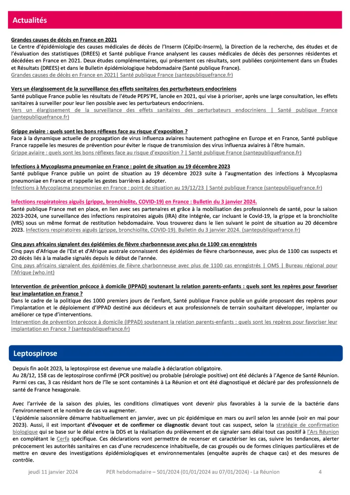 - Bronchiolite chez les moins de 2 ans : La Réunion est en épidémie de bronchiolite. Le taux de positivité VRS chez les moins de 2 ans était de 46% en S01 avec une co-circulation de VRS de type A et de VRS de type B.