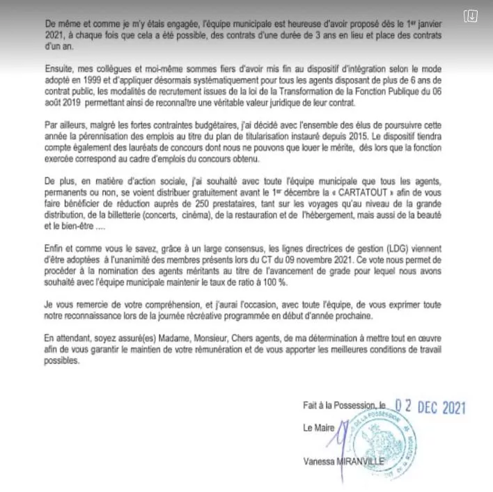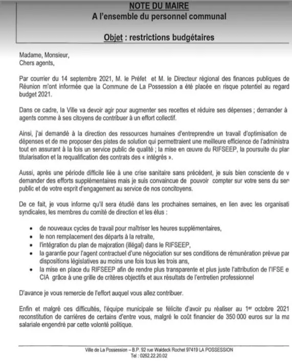 « Notre groupe politique, demain ensemble La Possession, tiens à tirer la sonnette d’alarme concernant la situation financière de la commune de La Possession. Nous apprenons que la mairie a été informée de son placement en risque potentiel par la préfecture par un courrier du 14 septembre 2021 qui stipule que la ville doit augmenter ses recettes et réduire ses dépenses. Cela signifie que des efforts seront demandés aux agents et à la population. Nous alertons sur d’éventuelles augmentations des impôts locaux sur la commune de La Possession qui seraient le signe d’une gestion malsaine des finances publiques de la ville.