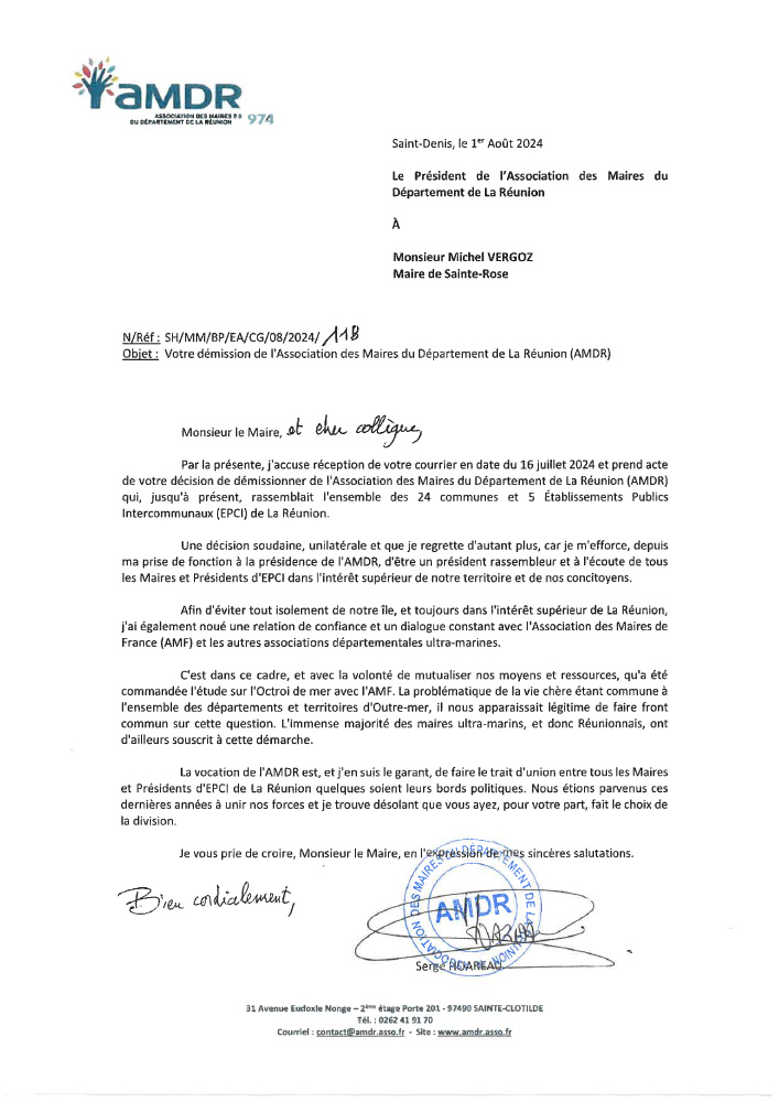 En réponse à cette démission, Serge Hoareau, président de l’AMDR a adressé, à son tour, une lettre à Michel Vergoz, dont voici la copie :