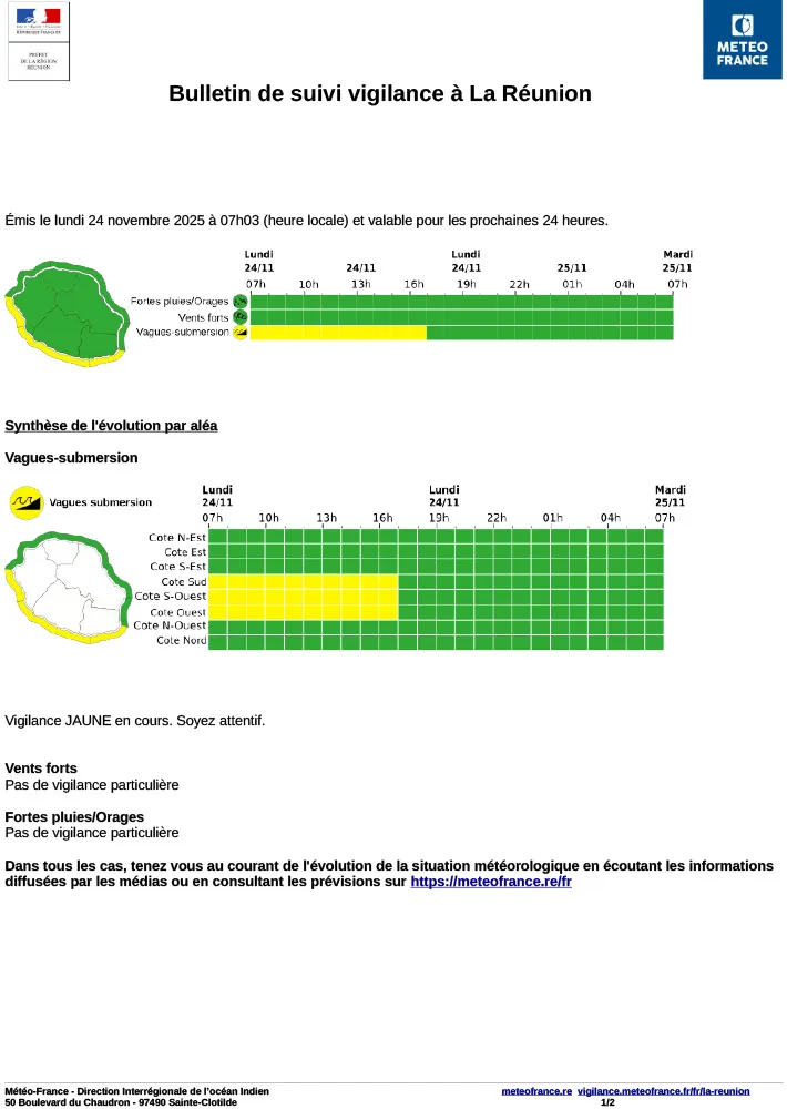 Météo-France place la côte Ouest, Sud et Sud-Est en vigilance jaune pour vagues-submersion de 7 h à 17 h.