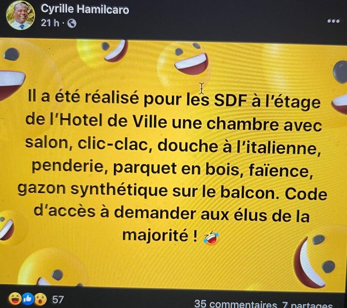 Un petit tour du côté de Saint-Louis à présent. Ça faisait longtemps. J’ai vu passer un post de Cyrille Hamilcaro sur son Facebook sur lequel il ironise à souhait. Je vous laisse le lire ci-dessus.