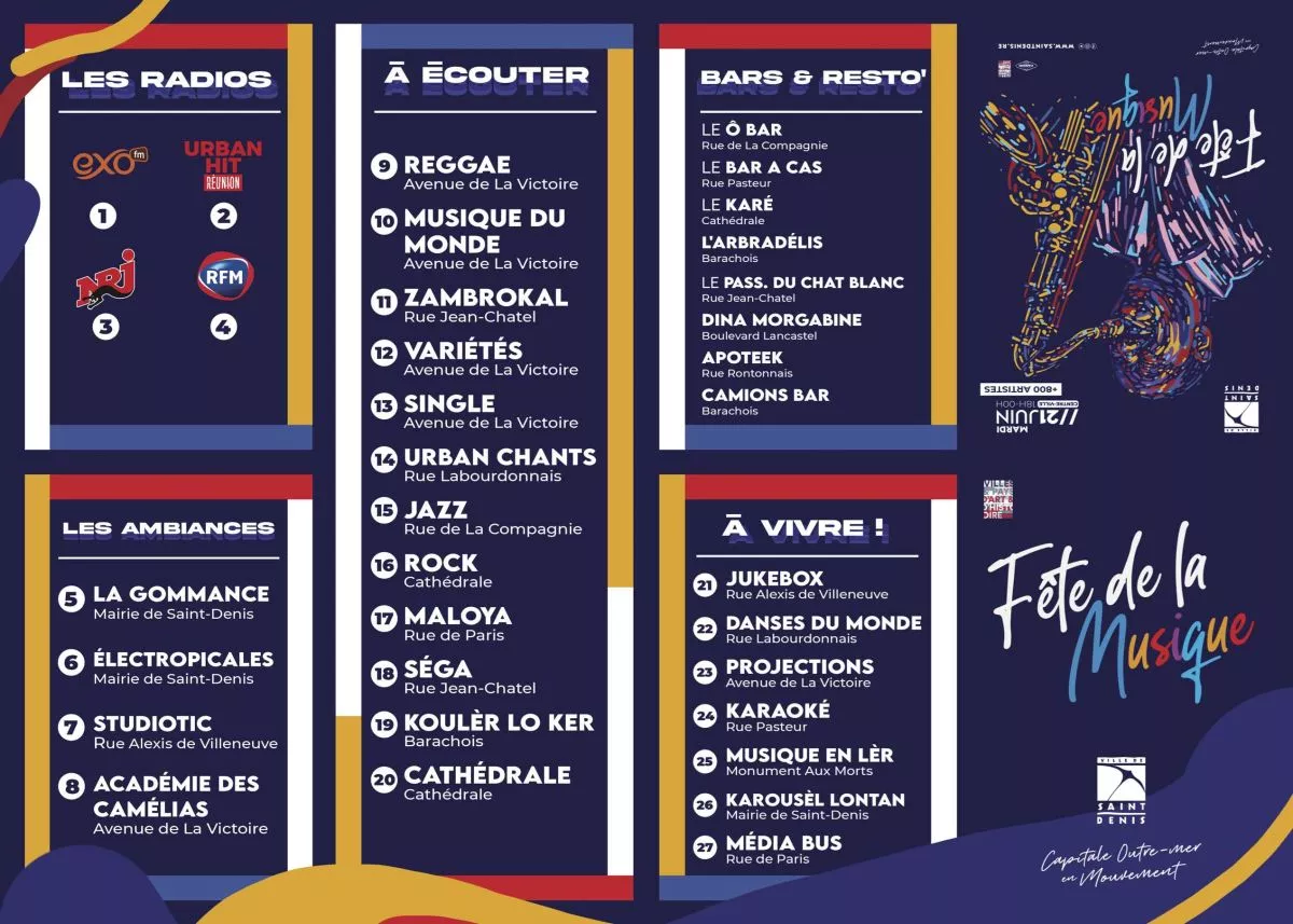 La Ville de Saint-Denis proposera une ambiance plutôt qu’une succession de concerts. Cette année, les commerçants du Centre-ville participeront avec : une quinzaine de bars et restaurants, des plateaux musicaux sur leur terrasse ou devant leurs établissements. Une implication qui prouve le dynamisme des commerçants dionysiens, comme ils l’ont déjà montré lors des journées commerciales ou de la Fête des Mères.