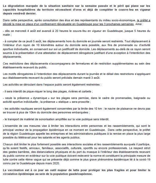En Guadeloupe, les commerces resteront ouverts, ainsi que les restaurants exclusivement pour le service du midi, mais les bars seront fermés, ainsi que les gymnases, stades et piscines. Il sera interdit de pique-niquer sur les plages où seule la présence dynamique sera permise, comme la promenade, la baignade ou l’activité sportive individuelle.
