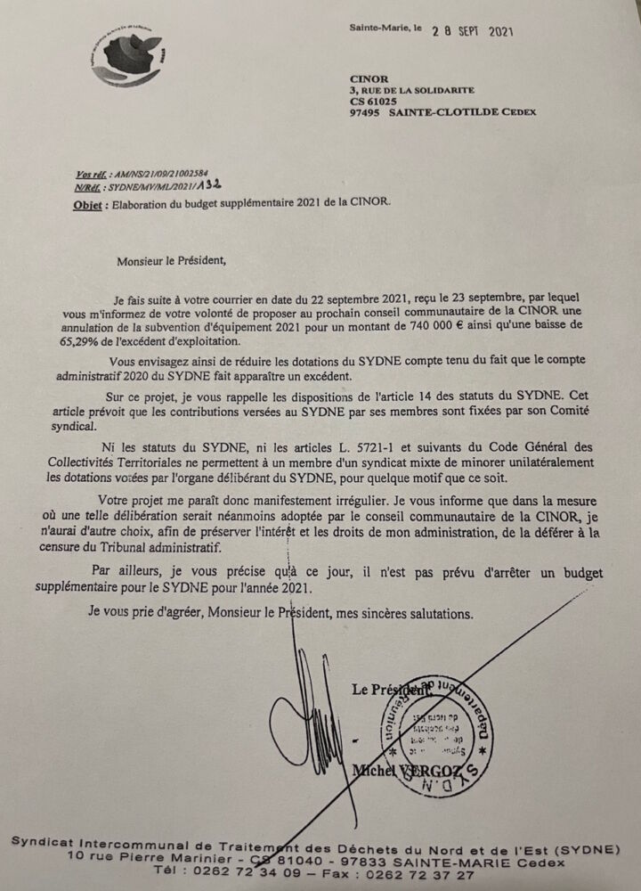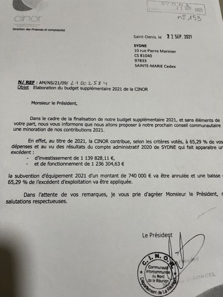 Poursuivant sa politique de mise à mort de SYDNE, le maire de Sainte-Suzanne et président de la CINOR a adressé le 22 septembre dernier à Michel Vergoz un courrier dans lequel il annonce que la CINOR va couper les vives à SYDNE. Je vous laisse lire la lettre :
