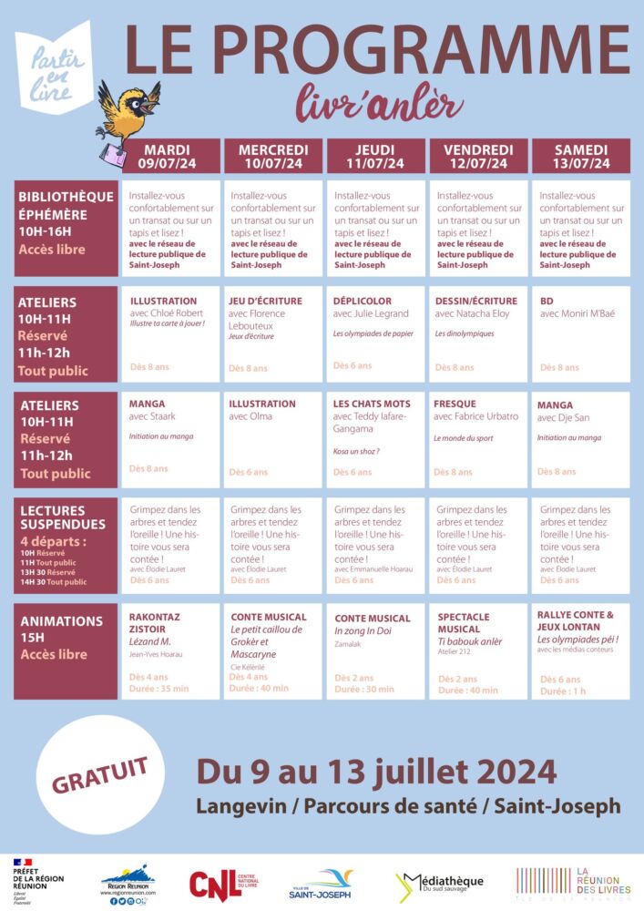 Livr’anlèr, ce sont 5 journées d’animations gratuites sur le Parcours Santé de Langevin à Ville de Saint-Joseph du 9 au 13 juillet 2024.