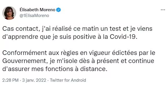 Elisabeth Moreno, ministre déléguée chargée de l’Égalité entre les femmes et les hommes,  a annoncé lundi être testée positive au Covid-19. Dans un Tweet, elle déclare « poursuivre ses fonctions à distance.
