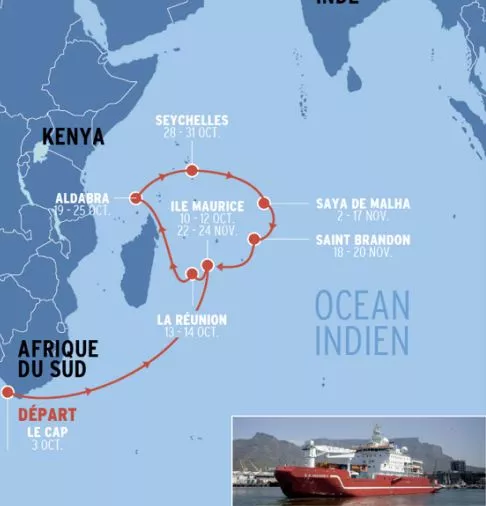 4 escales, un périple d’environ 7 300 milles marins (13 500 km) et 2 mois de navigation ponctués et rythmés par les différentes opérations de recherche et de terrain programmées tout au long du trajet du bateau et au cours des stations prévues autour de l’atoll d’Aldabra, sur le banc Saya de Malha, où 15 jours d’investigations sont prévus, et enfin autour de l’île de Saint Brandon.
