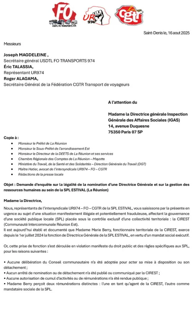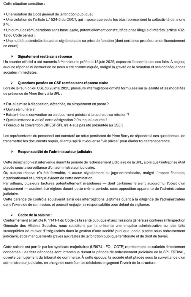 L’intersyndicale UR974 – FO – CGTR de la SPL ESTIVAL a adressé un courrier officiel aux autorités locales pour alerter sur des faits graves et potentiellement illégaux concernant la nomination de Marie Berry en tant que Directrice Générale de cette société publique locale.