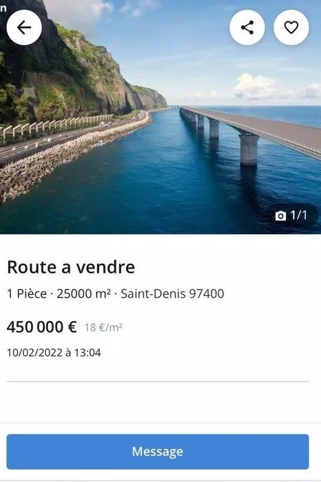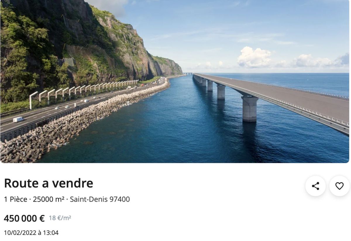 Ca prête à sourire et c’est là pour faire le buzz assurément, mais on a trouvé ça marrant et on partage l’info. Un internaute a mis en vente la Nouvelle Route du Littoral sur le site de petites annonces « leboncoin », ici :