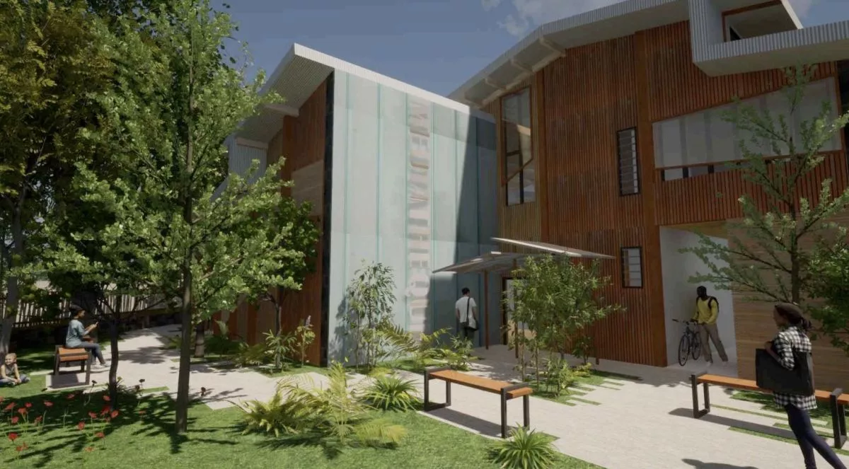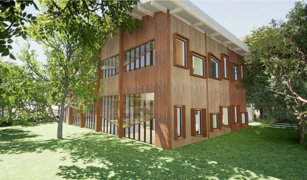 En été ; la température sera gérée à l’aide de la ventilation naturelle ; de larges ouvertures sont prévues sur les façades Est et Ouest. Afin que les différents espaces puissent bénéficier de ces qualités thermiques, l’architecte a proposé de répartir les différentes activités dans trois volumes reliés entre eux. Ainsi ces derniers viennent glisser les uns contre les autres générant des espaces extérieurs. Les trois volumes reprennent la même typologie de façade avec la création d’une écope en toiture afin de permettre la ventilation naturelle. Outre les parties maçonnées des murs trombes, le bâtiment sera en ossature bois.