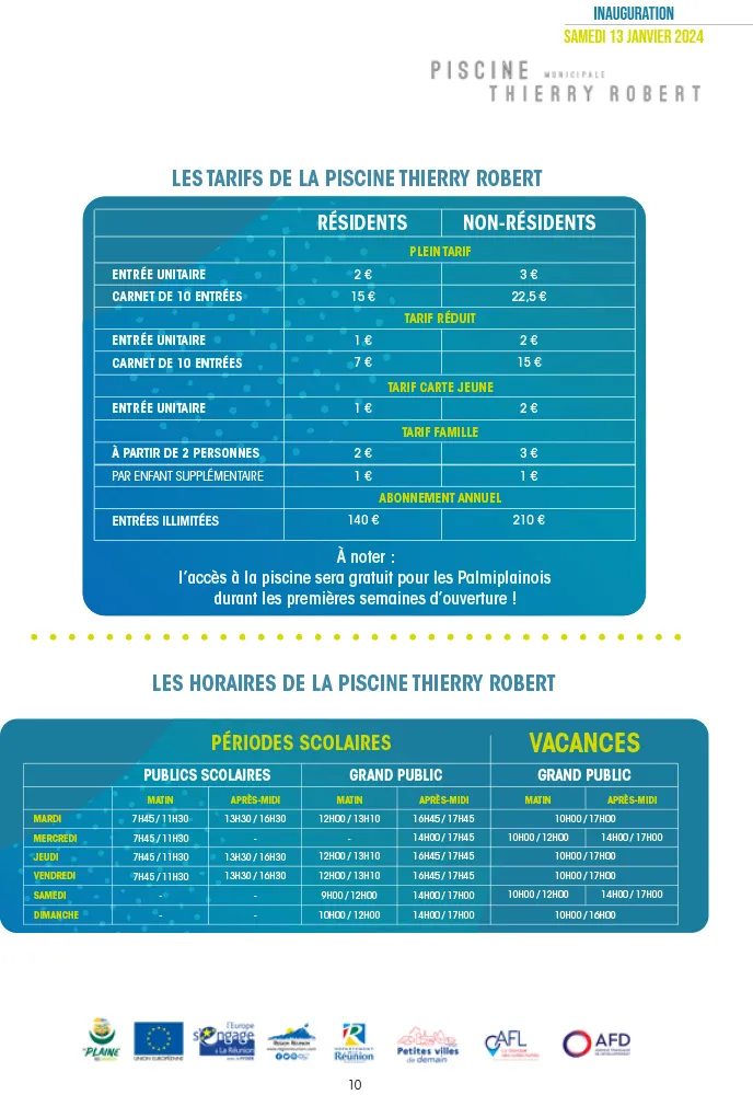 Le public pourra aussi bénéficier de créneaux sur la semaine (pause méridienne et les mercredis, samedis et dimanches). Les horaires et tarifs de la piscine municipale sont à retrouver en page 10. À noter : l’accès à la piscine sera gratuit pour les Palmiplainois durant les premières semaines d’ouverture !