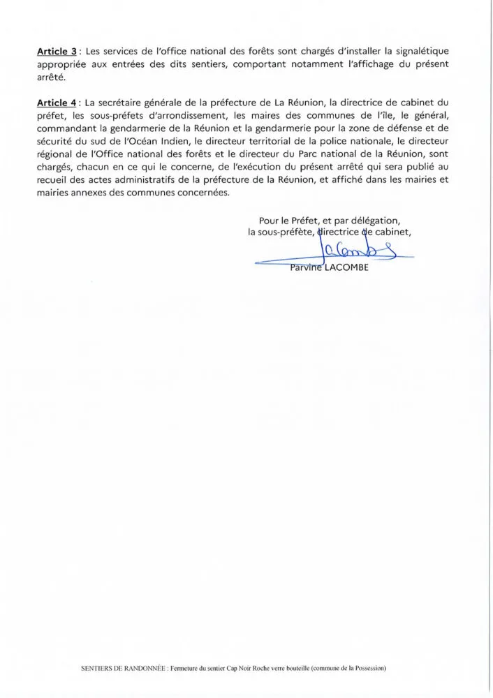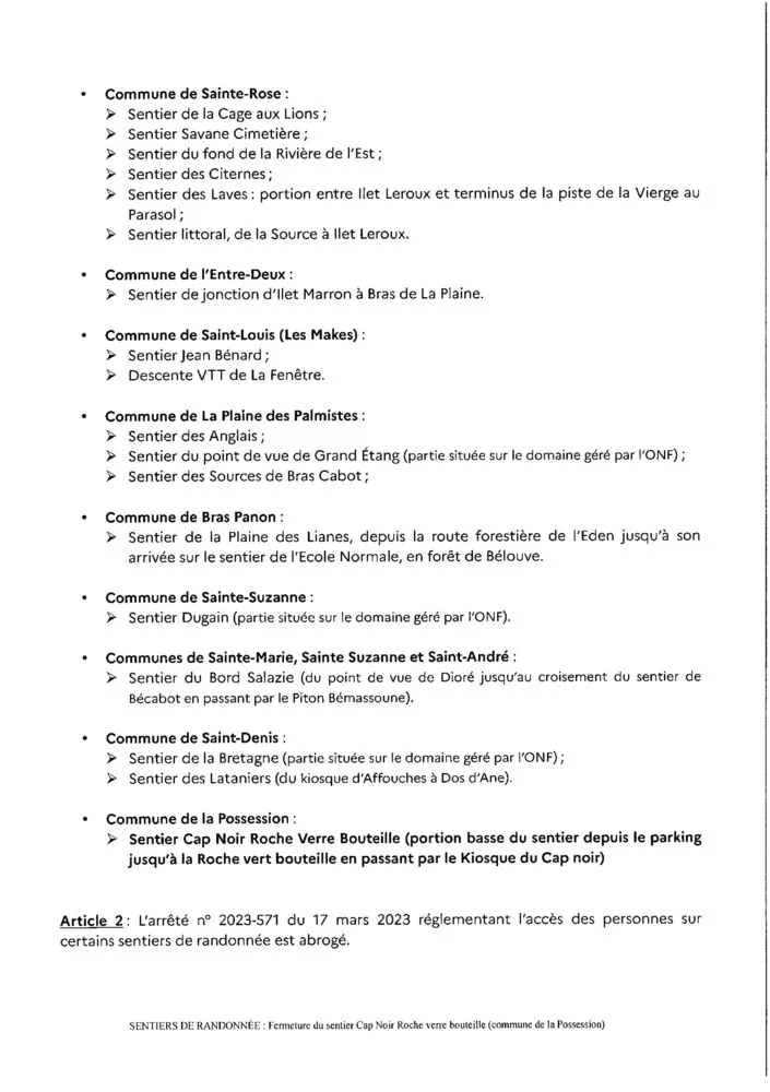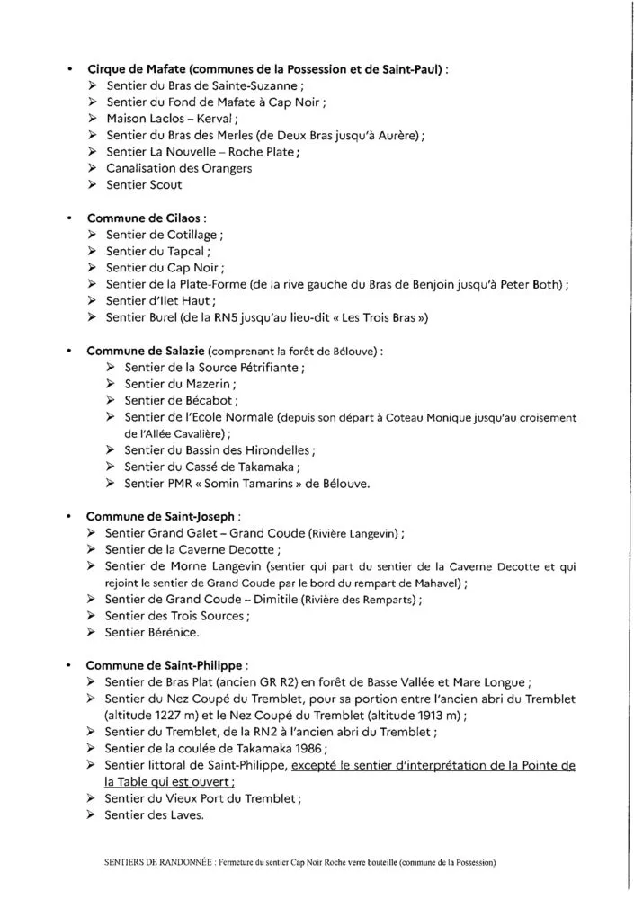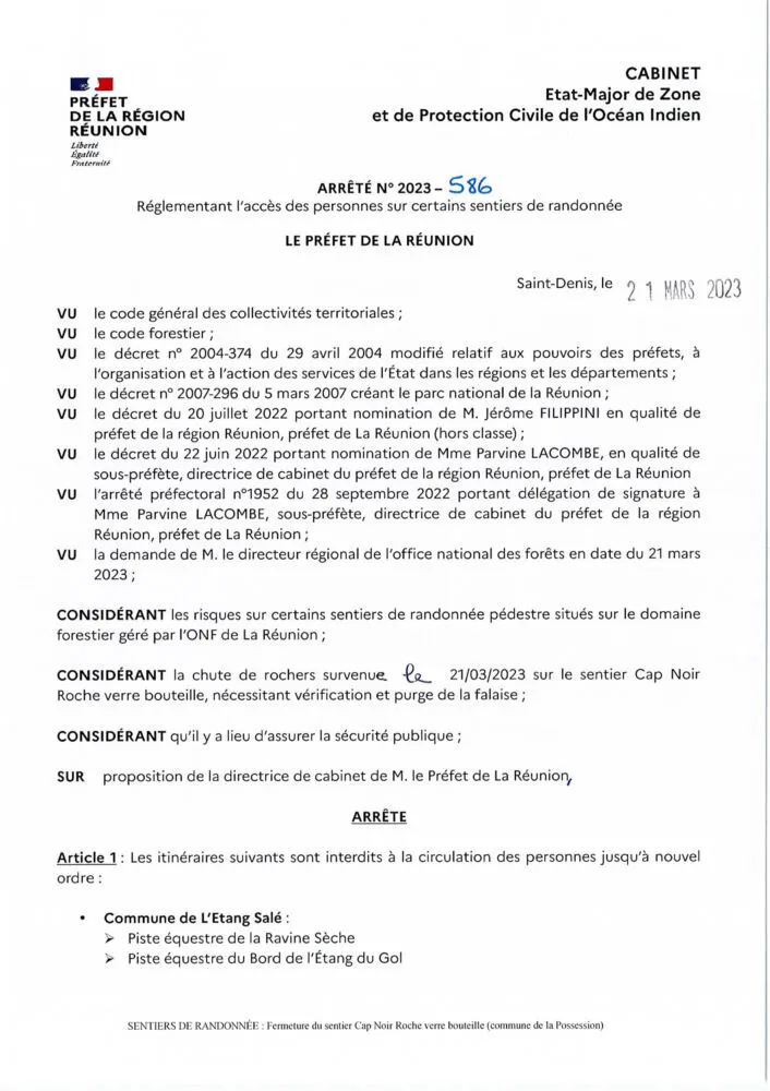 Un éboulis recouvrant une portion du sentier a été constaté sur le sentier Cap Noir Roche verre bouteille. Des masses rocheuses instables en amont menacent le sentier et doivent être purgées. En attendant la réalisation de ces travaux, le risque accru de chutes de pierre est incompatible avec la présence de randonneurs, l’accès au public doit donc être interdit.