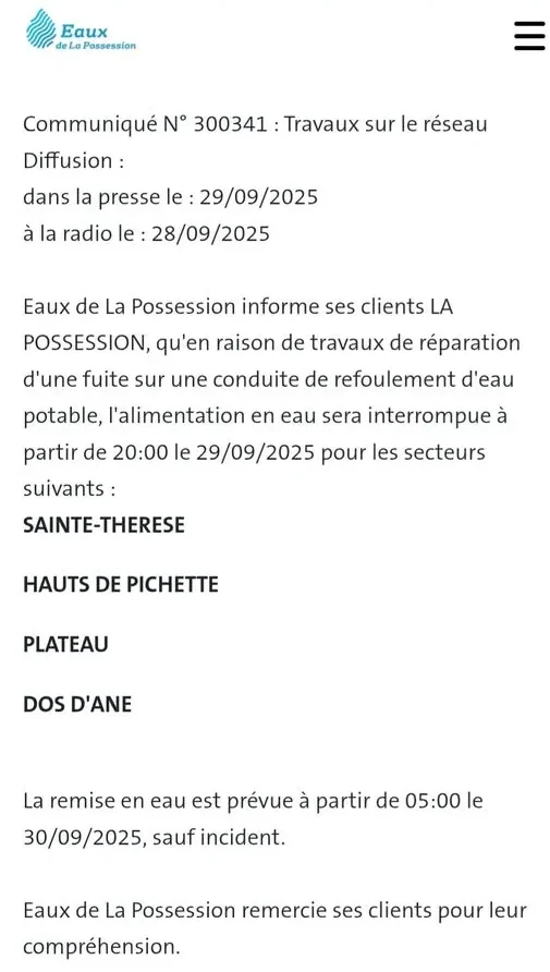 Les habitants de La Possession doivent se préparer à une coupure d’eau programmée. La société Eaux de La Possession annonce que des travaux de réparation sur une conduite de refoulement d’eau potable nécessiteront une interruption de l’alimentation en eau à partir du lundi 29 septembre 2025 à 20h00.