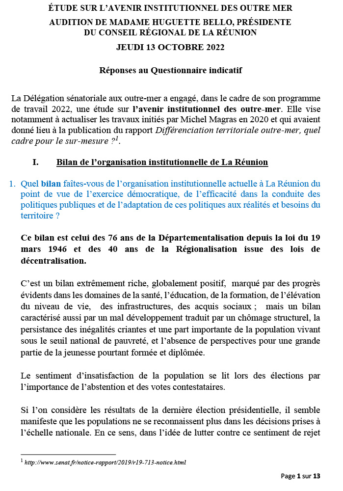 La Présidente de la Région Réunion a rappelé la position très claire qu’elle avait déjà exprimée devant la délégation sénatoriale sur l’avenir institutionnel des Outre-mer ( cf document joint) : la question centrale est celle de la réflexion sur la gouvernance et les moyens juridiques pour atteindre les objectifs de développement.