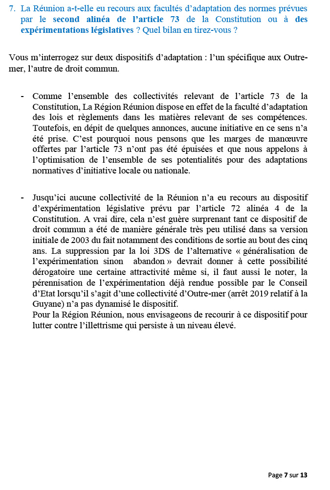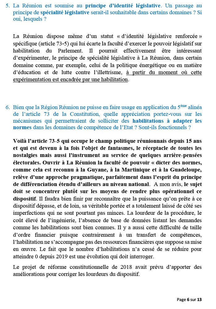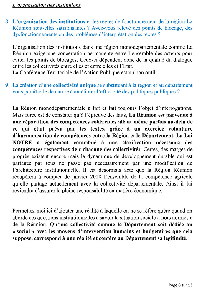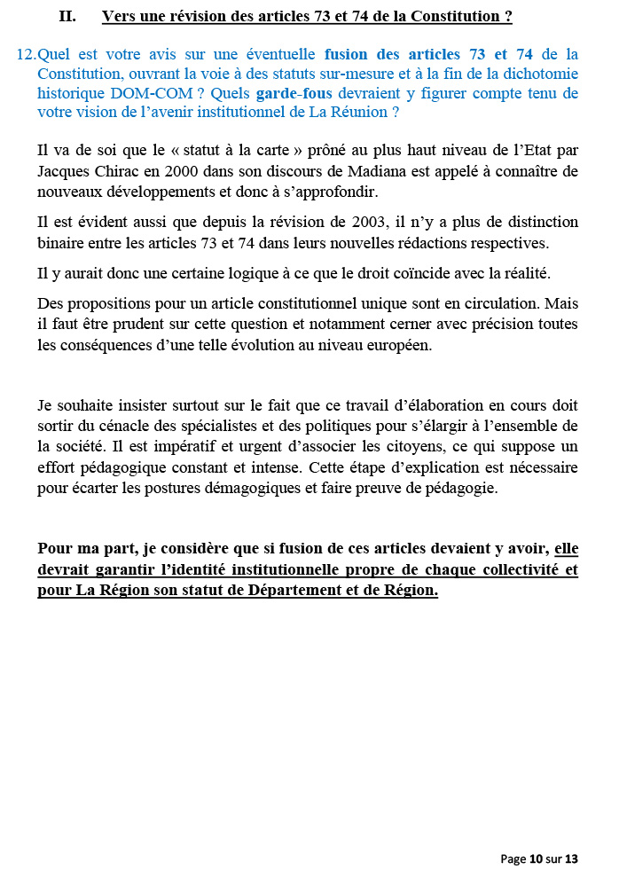 La Réunion ne peut avoir moins de droits que la Guadeloupe, la Martinique, la Guyane et les autres régions de l’Hexagone. Chaque territoire doit pouvoir déterminer ce qui lui convient le mieux, dans le cadre de la République. À La Réunion, personne ne remet en cause le statut et la spécificité de  »Région mono-départementale » que nous partageons avec la Guadeloupe.