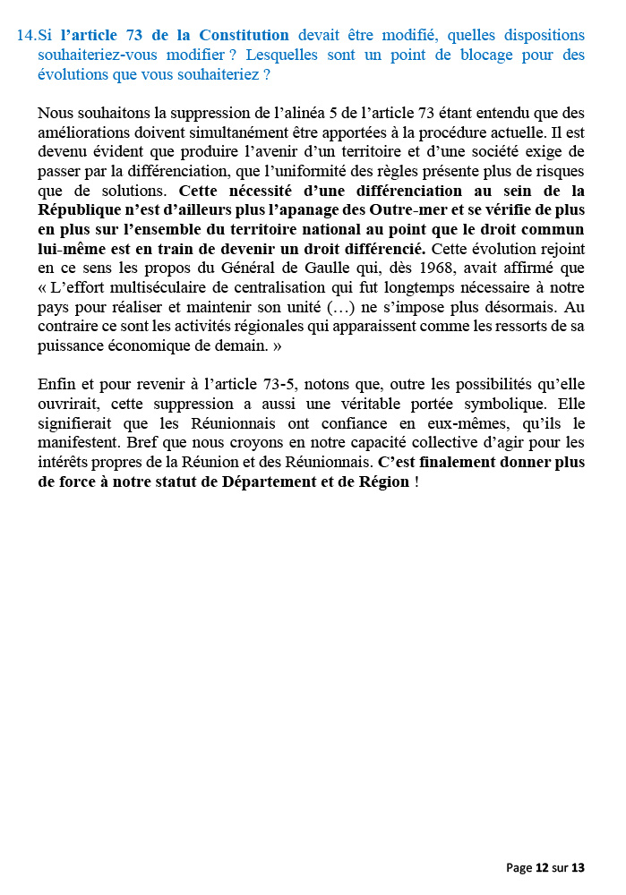 2. Ombeline bizarrement ou té sénatrice au sénat ou té député a l’Assemblée nationale et européenne et c’est que maintenant ou dévoile réyoné que la Réunion est tenu a la george par un amendement raciste et colonialiste en gros si y donne l’autonomie à la Réunion, nous sera tjrs tenu en laisse comme le chien,en gros la Réunion c’est pas un département mais une colonie que zot lé sénateurs, député,et élus y manipule réyoné en gros c’est juste zot portefeuilles y compte bande de collabo et traite