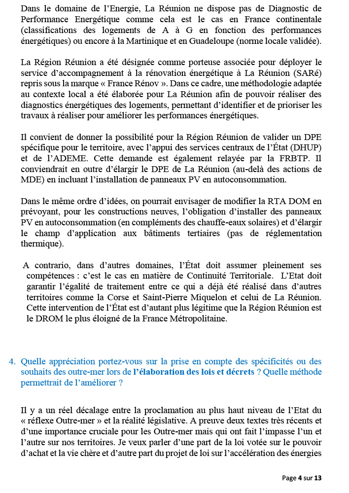 Les propositions sur l’action publique recouvre deux aspects : l’organisation institutionnelle, d’une part, et l’adaptation du droit en outre-mer, d’autre part. Sur la question de l’organisation institutionnelle, la Présidente Huguette Bello a rappelé que le cadre spécifique à La Réunion, et en Guadeloupe, de  »Région mono- départementale » était en l’état actuel adapté à leurs situations mais qu’il exigeait une plus grande clarification dans la répartition des compétences entre les deux collectivités.