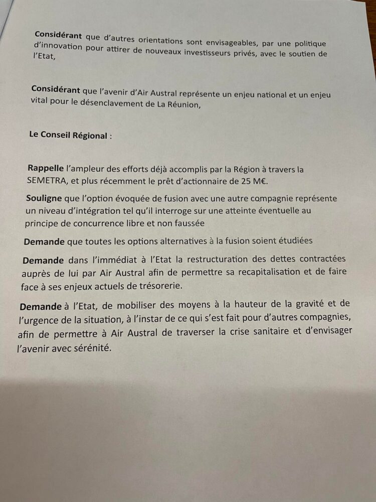 Avant l’examen de l’ordre du jour consacré au SAR (Schéma d’Amenagement Régional), les élus de la Région Réunion ont voté une motion demandant l’urgence sur le dossier Air Austral.