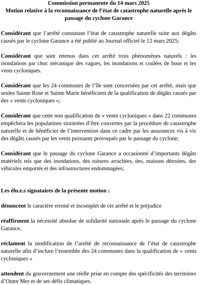Lors de la commission permanente du 14 mars 2025, la Région Réunion a adopté une motion demandant la reconnaissance complète de l’état de catastrophe naturelle suite aux importants dégâts causés par le passage du cyclone Garance. L’arrêté constatant cet état a été publié au Journal officiel le 12 mars 2025, mais il a fait l’objet de vives critiques de la part des élus locaux, qui dénoncent des insuffisances dans le cadre de cette reconnaissance.
