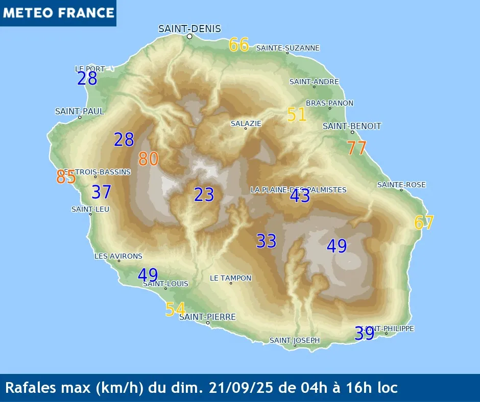 Le vent s’est également renforcé. Des rafales ont été mesurées à 85 km/h à la Pointe des Trois-Bassins, 80 km/h au Maïdo et 77 km/h à Saint-Benoît. L’alizé de sud-est restera marqué ce lundi 22 septembre, avec des pointes pouvant approcher à nouveau les 80 km/h, notamment autour de Saint-Pierre.