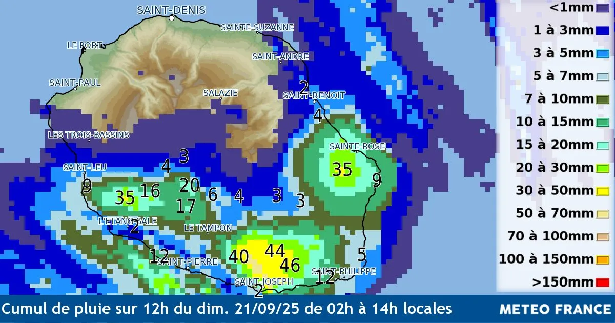En une douzaine d’heures, les cumuls de pluie ont atteint 47 mm à La Crête, 44 mm à Grand Galet, 41 mm à Piton-Bloc, 35 mm au Tévelave et sur les Hauts de Sainte-Rose. À Pierrefonds-aéroport, on a relevé 12 mm, et 9 mm à Saint-Leu. Le nord est resté globalement plus abrité.