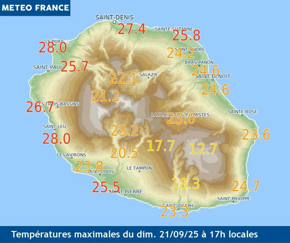 Ce front s’est accompagné d’un refroidissement notable. Les températures maximales ont chuté de 2 à 6 degrés sur la moitié sud, par rapport à la veille. À Grand-Coude, la baisse a atteint 7 degrés (15,1°C contre 22,1°C samedi). À Cilaos, on a relevé 18,1°C contre 24,2°C la veille, soit 6 degrés de moins. L’Entre-Deux a perdu 5 degrés (20,5°C contre 25,7°C) et le Pas de Bellecombe-Jacob est descendu à 12,7°C, contre 17,8°C samedi.