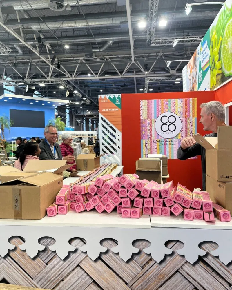 “Notre stand est le premier à l’entrée du Village Réunion. Nous avons la responsabilité d’accueillir les visiteurs avec nos douceurs : bonbons-miel, bonbons-cravates, chemins de fer créole, bonbons-curcuma… Un vrai voyage gustatif dès le premier regard.”