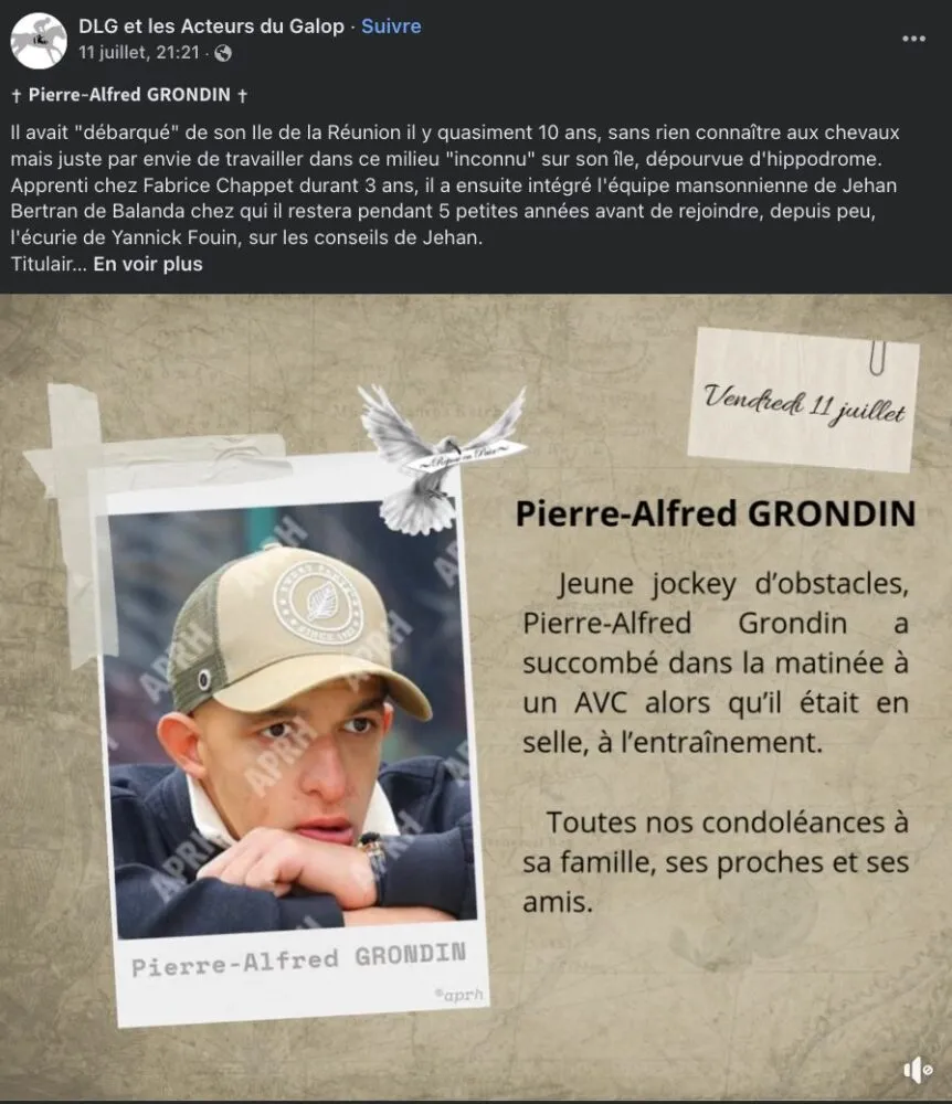 Pierre-Alfred Grondin est décédé ce vendredi, emporté brutalement par un accident cardio-neuro-vasculaire. Il n’avait que 23 ans. Ce jeune homme originaire de La Réunion avait quitté son île natale pour vivre un rêve : celui de monter à cheval au plus haut niveau. Un rêve qu’il poursuivait avec acharnement et humilité, en silence, dans les coulisses exigeantes du monde hippique métropolitain.