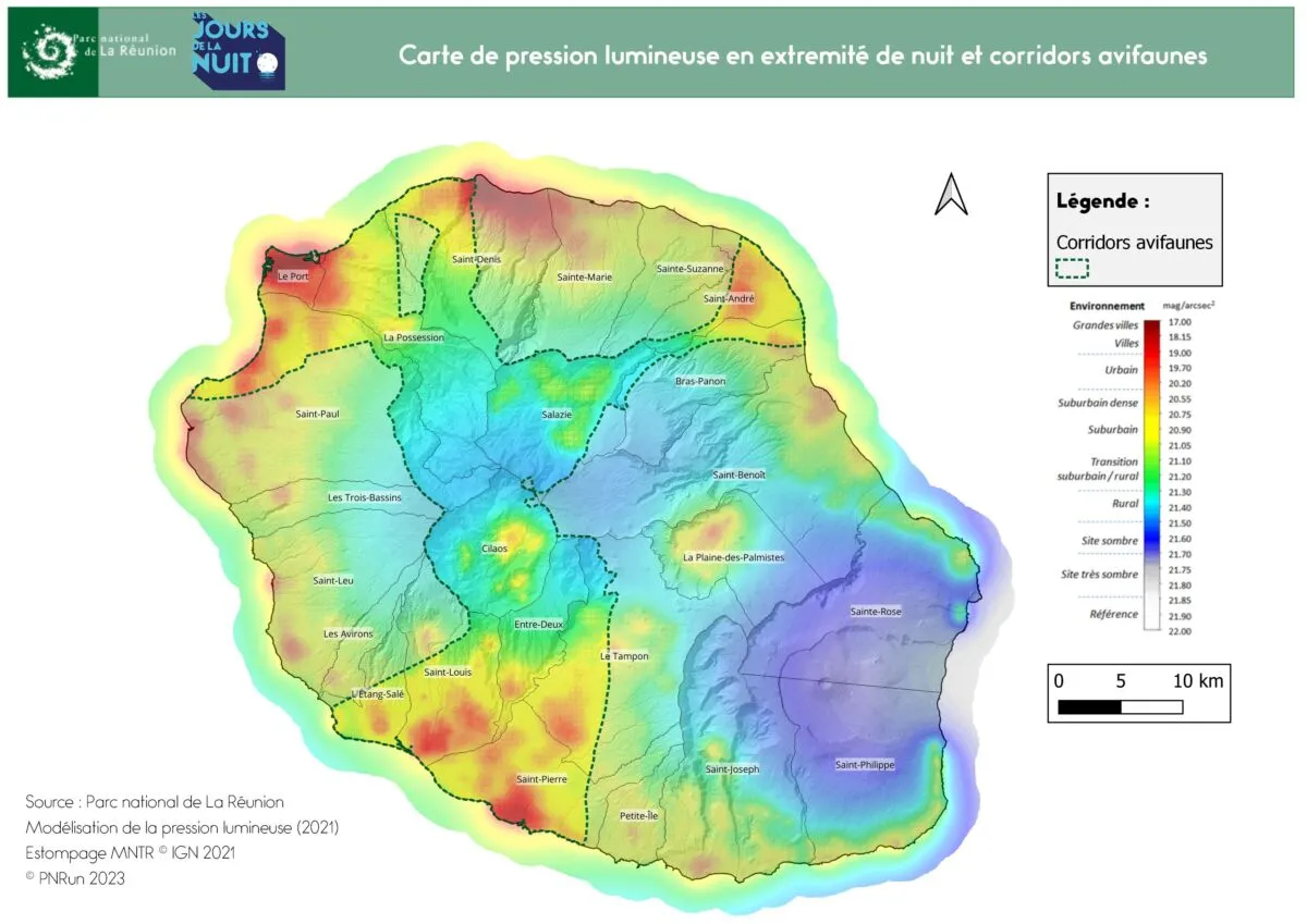 Voici un article synthétique basé sur les documents et la carte que vous avez fournis :Du 11 avril au 7 mai 2025, l’île de La Réunion participe activement à une vaste opération d’extinction de l’éclairage public dans le cadre du programme « Les Jours de la Nuit », porté par le Parc national. Objectif : protéger les espèces sensibles à la pollution lumineuse, notamment les pétrels juvéniles, oiseaux marins endémiques gravement menacés par les lumières artificielles.