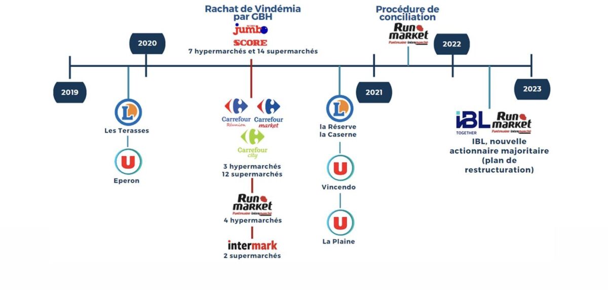 Le secteur a, d’autre part, connu des changements d’actionnaires significatifs sur la période. Le Groupe Bernard Hayot (GBH) a pris le contrôle de la société Vindémia Group (filiale du groupe Casino dans l’océan Indien) qui exploitait sept hypermarchés et quatorze supermarchés sous les enseignes Jumbo Score et Score respectivement. Cette opération a été autorisée par l’Autorité de la concurrence le 26 mai 2020, contre la cession de certains magasins. Quatre des hypermarchés ont ainsi été repris par le groupe Make Distribution, sous enseigne Run Market (partenaire d’Intermarché), et 2 supermarchés ont été cédés au groupe Thien-Ah Koon (enseigne Intermark). Au final, 3 hypermarchés Jumbo et 12 supermarchés Score ont rejoint GBH sous enseigne Carrefour.