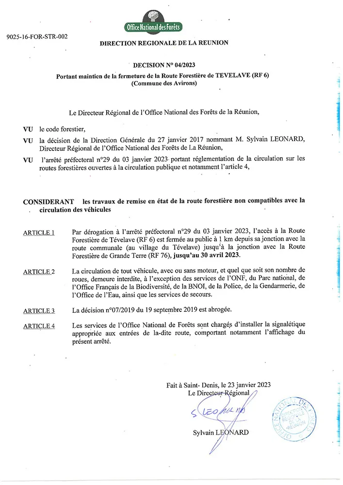 Depuis janvier 2018 et le cyclone Berguita, la route forestière du Tévelave est fermée au public : elle fait l’objet d’importants travaux de consolidation et de reconstruction.