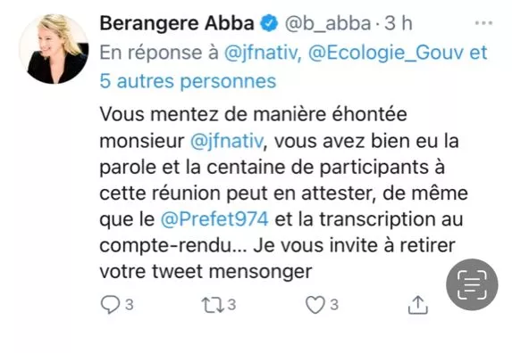 Jean-François Nativel a ensuite posté un tweet dans lequel il a exposé son mécontentement. Pas contente, Bérangère Abba a répondu à son tour, toujours via un tweet : « vous mentez de manière éhontée monsieur… »