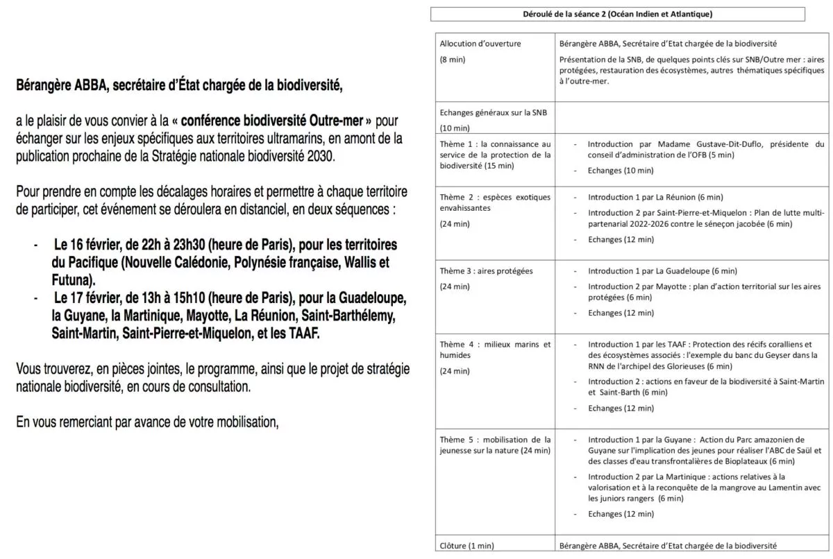 « En tant que membre de la commission transition écologique et solidaire, j’ai été invité à une visioconférence de présentation du plan biodiversité outre-mer d’une durée de 2h30 (début à 16h). Voici le programme prévu lors de cette séquence », explique-t-il.