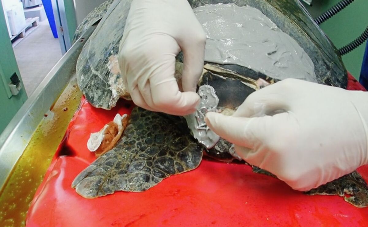 « Deux heures d’opération ont été nécessaires pour réduire les fractures ouvertes et profondes de la jeune tortue verte SPEEDY, victime d’un choc avec un Foil de bateau rapide. Le Foil a percuté l’arrière de la tortue en passant sous la nageoire arrière droite qui a été en partie cisaillée et les os tibia- péroné brisés en plusieurs morceaux.
