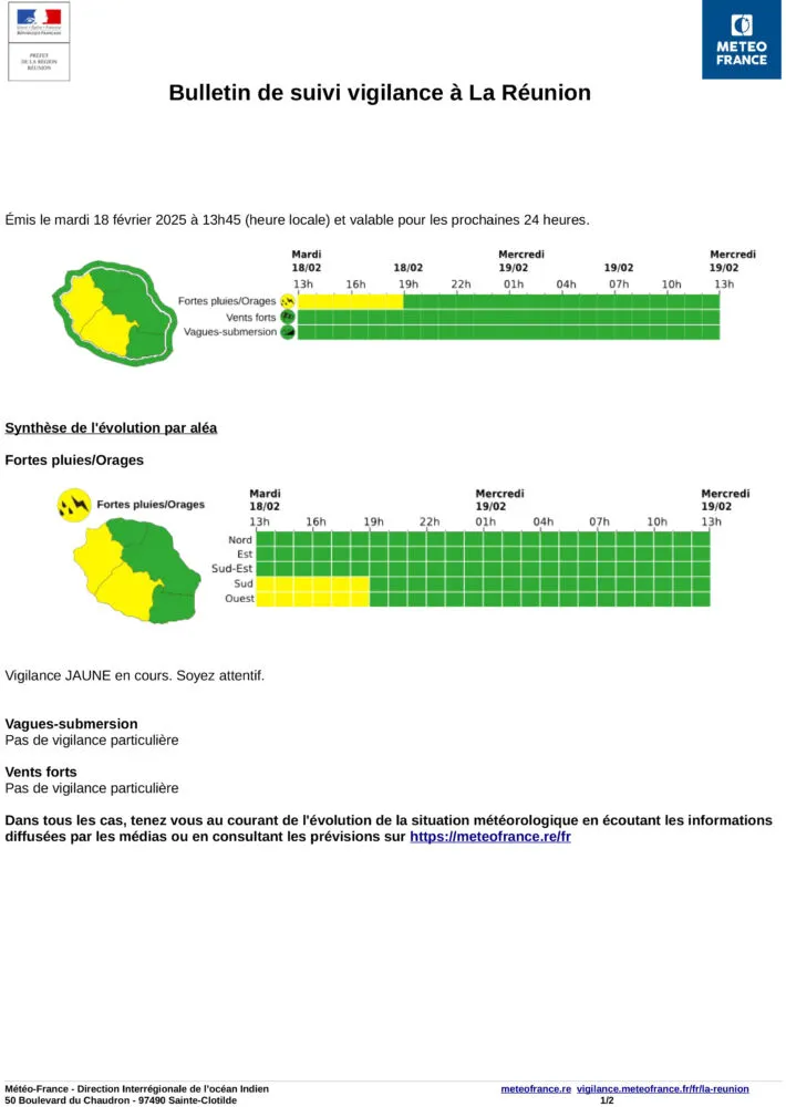 Actualités La vigilance jaune pour fortes pluies et orages est levée par La rédaction F R 18 février 2025 1 min de lecture 1 Dans son bullein météorologique publié ce mardi après-midi, Météo France a levé la vigilance jaune fortes pluies/orages concernant la zone Ouest et Sud de La Réunion,valable depuis 13h. Ne manquez pas toute l’actualité de La Réunion ! Abonnez-vous à la newsletter de Free Dom ! Valider Partager Facebook Twitter Pinterest Linkedin Whatsapp Reddit Email Vous pourriez être intéressé par 1 janvier 2026 Jeudi 1ᵉʳ janvier 2026 – Météo, éphéméride et horoscope du jour 31 décembre 2025 Mercredi 31 décembre 2025 – Météo, éphéméride et horoscope du jour 30 décembre 2025 Mardi 30 décembre 2025 – Météo, éphéméride et horoscope du jour La rédaction F R 1 Commentaire hier aussi i disait la même chose y avait que la chaleur Répondre Signaler un commentaire Laisser un commentaire Annuler la réponseYour email address will not be published. Enregistrer mon nom, mon e-mail et mon site dans le navigateur pour mon prochain commentaire. Current ye@r * Leave this field empty Article précédent Rodrigues : un sexagénaire arrêté après la découverte du corps démembré d’une adolescente sur la plage Article suivant Accident de trottinette à Bras-Panon : l’hélicoptère du SMUR mobilisé Articles récents... Jeudi 1ᵉʳ janvier 2026 – Météo, éphéméride et horoscope du jour Mercredi 31 décembre 2025 – Météo, éphéméride et horoscope du jour Hommage à Johnny Hallyday sur Free Dom 2 ce 5 décembre Mardi 30 décembre 2025 – Météo, éphéméride et horoscope du jour Saint-Joseph : découverte de 2337 plants de cannabis, arrestation de 2 individus Point sur le réseau routier départemental, 29 décembre à 16H30 Suicide sur le pont de la Rivière d’Abord : importante mobilisation des secours et des forces de l’ordre Radier submergé à Ilet Furcy : la route de Cilaos fermée à la circulation cette nuit Fortes pluies : appel à la plus grande prudence à Saint-Paul Saint-Gilles-les-Bains : une route impraticable, les riverains montent au créneau (VIDEOS)